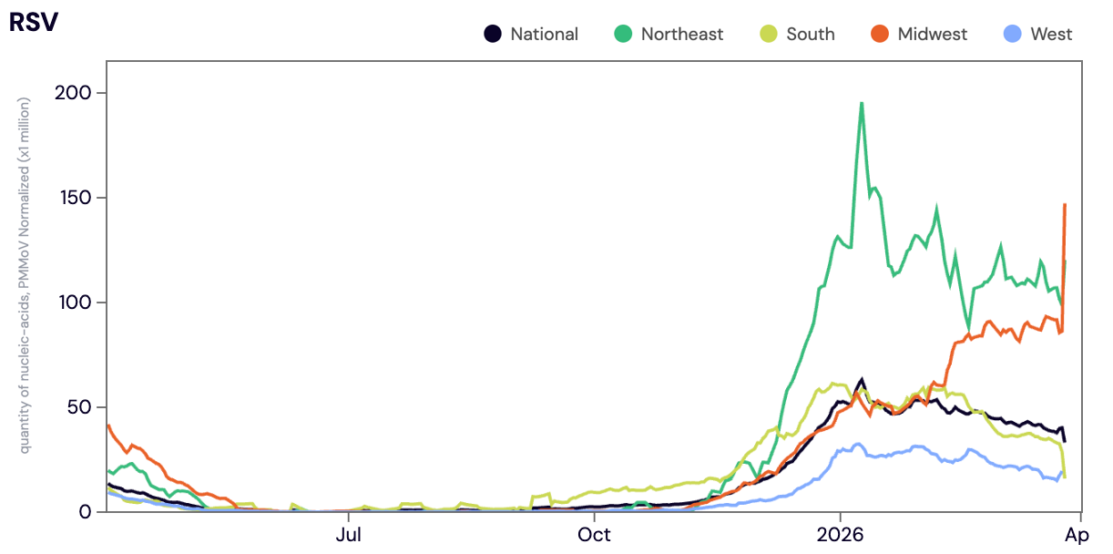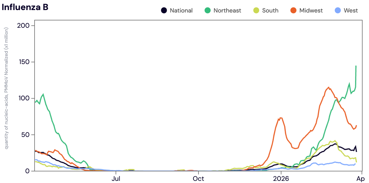 Influenza B (IBV) RNA was detected in ~76% of samples in March 2026. The median IBV RNA concentration across all sites in March 2026 was 8,523 copies/gram. The median IBV concentration in March 2026 was down ~3% compared to February 2026. Concentrations of IBV have been elevated in sites across the Midwest since early December 2025 and we've seen IBV concentrations steadily increasing across sites in the Northeast and South since late January 2026. As a reminder, during last years respiratory virus season (2024-2025) the national WWSCAN network did not hit seasonal onset for IBV until early March 2025.