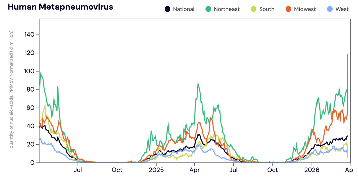 HMPV (human metapneumovirus) RNA was detected in ~73% of samples in March 2026. The median HMPV RNA concentrations across all sites in March 2026 was 9,169 copies per gram. The median HMPV concentration in March 2026 was up ~11% compared to February 2026. HMPV concentrations have been steadily rising across all regions since late December 2025.