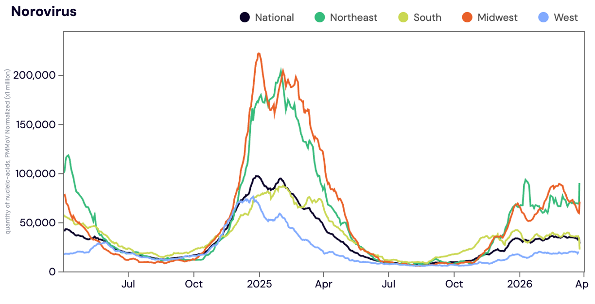 Norovirus GII (HuNoV GII) RNA was detected in 100% of samples analyzed in March 2026. The median Norovirus concentration in March 2026 was down ~8% compared to February 2026. Last year, we saw Norovirus concentrations start to increase in early October 2024 and peak early February 2025. While we saw a slower start to the winter Norovirus wave this year (2025-2026), the pattern is similar to what we observed during the 2023-2024 winter Norovirus wave.