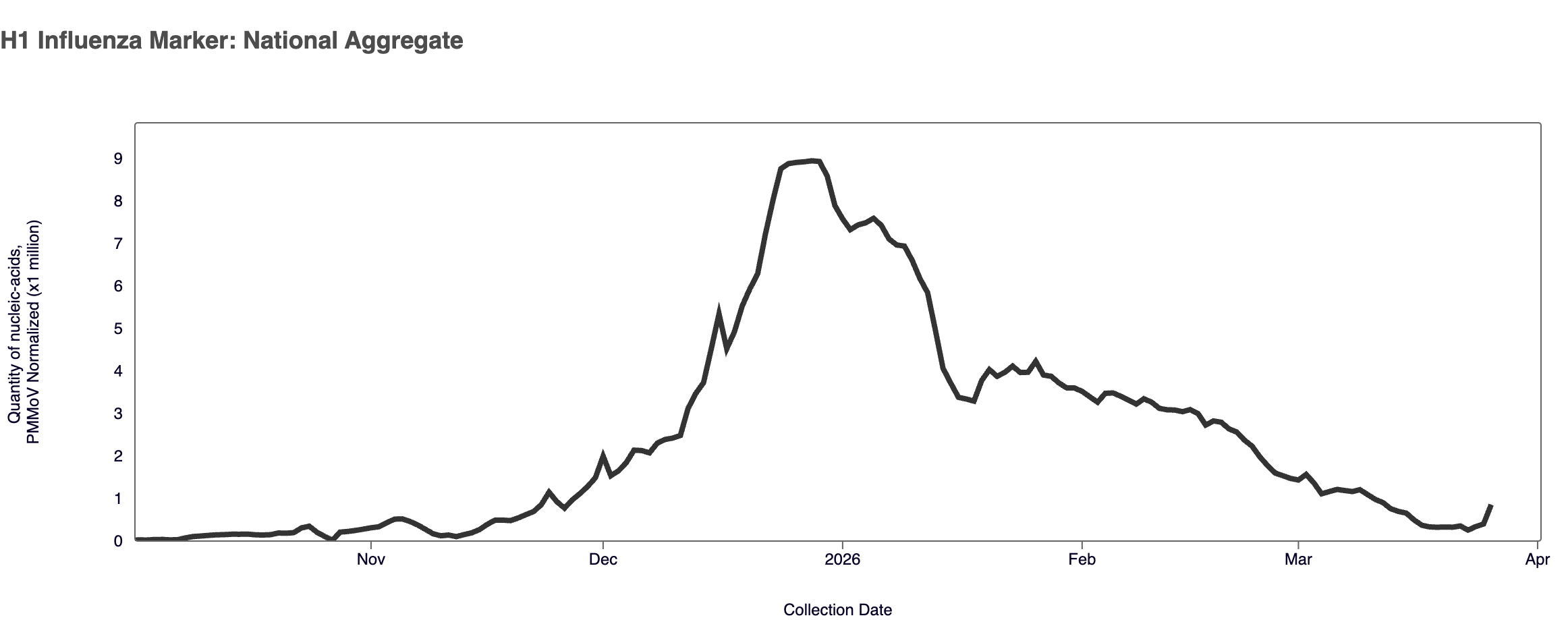 Plot shows last 6 months of data for the WWSCAN national aggregate of the H1 marker. Note the y-axis scale shows normalized wastewater concentrations for the H1 influenza marker.