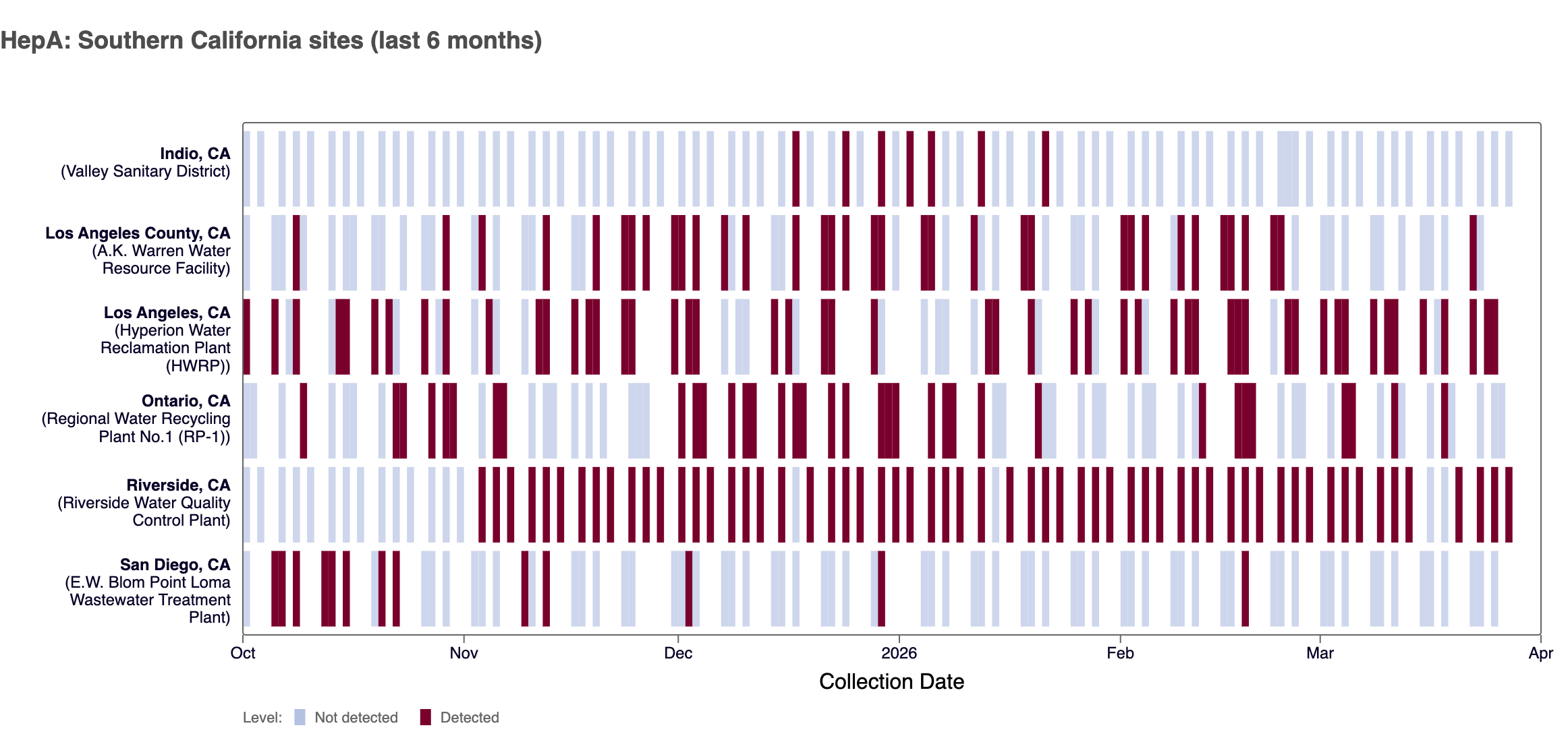 Heat map shows last 6 months of Hepatitis A wastewater data from WWSCAN sites in Southern California. Blue indicates non-detect.