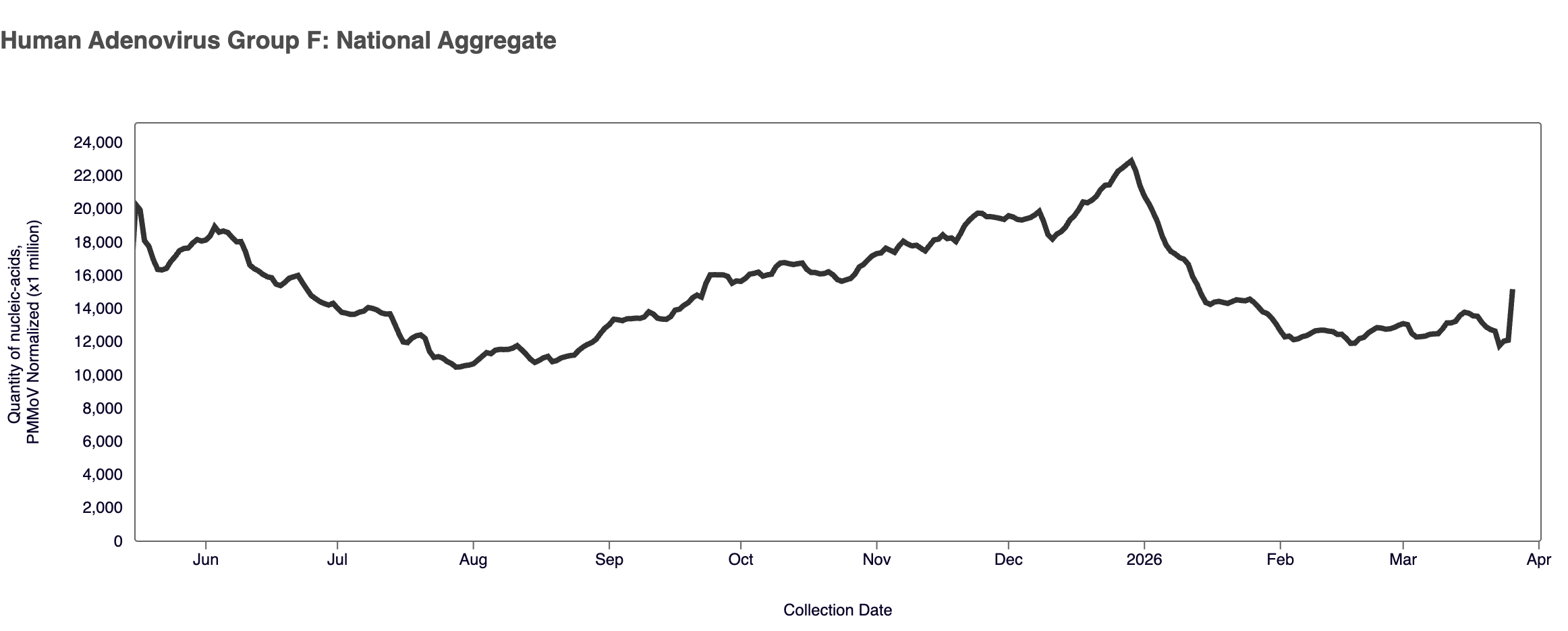 Plot shows ~ last 11 months of HAdV-F for the WWSCAN national aggregate since monitoring resumed. Note the y-axis scale shows normalized wastewater concentrations for HAdV-F.