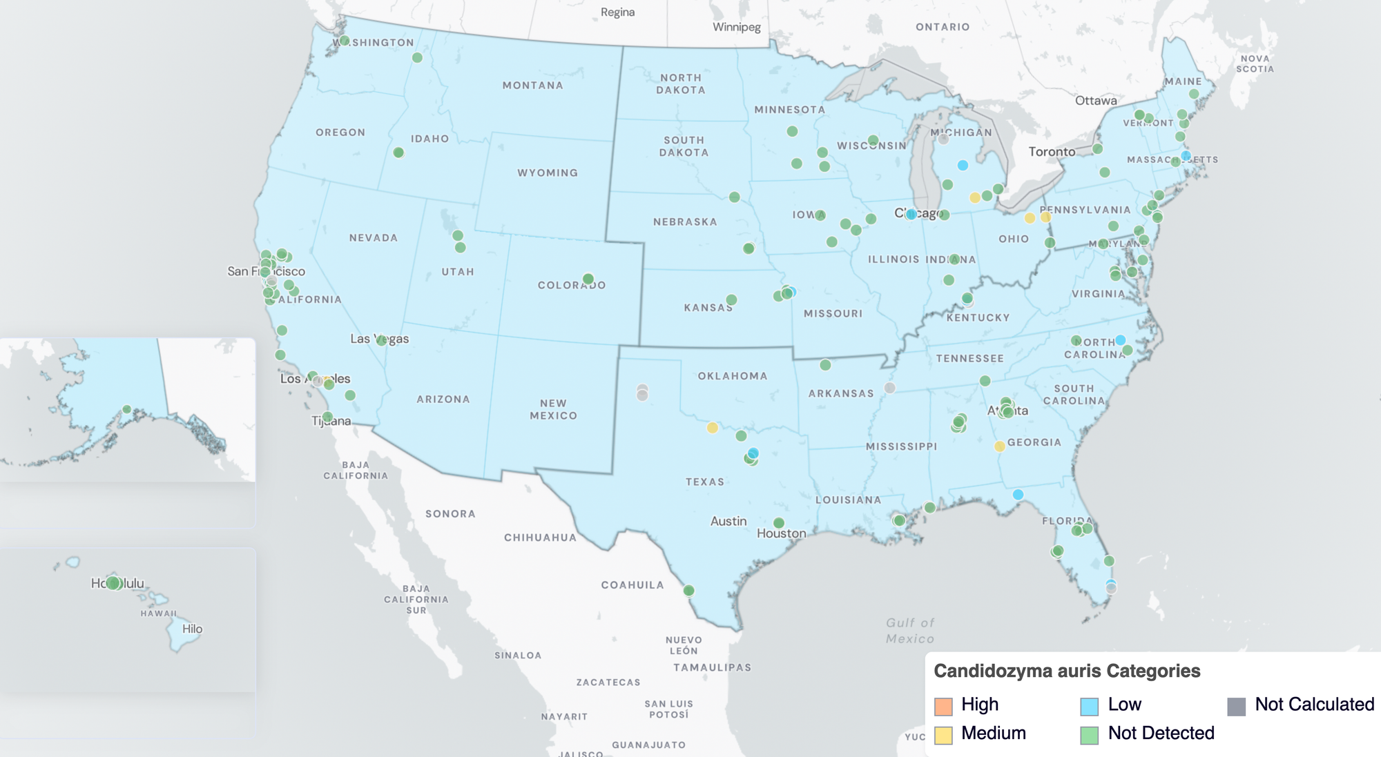 Below are the C. auris wastewater categories for all WWSCAN sites (recall the category is determined by the frequency of detection).