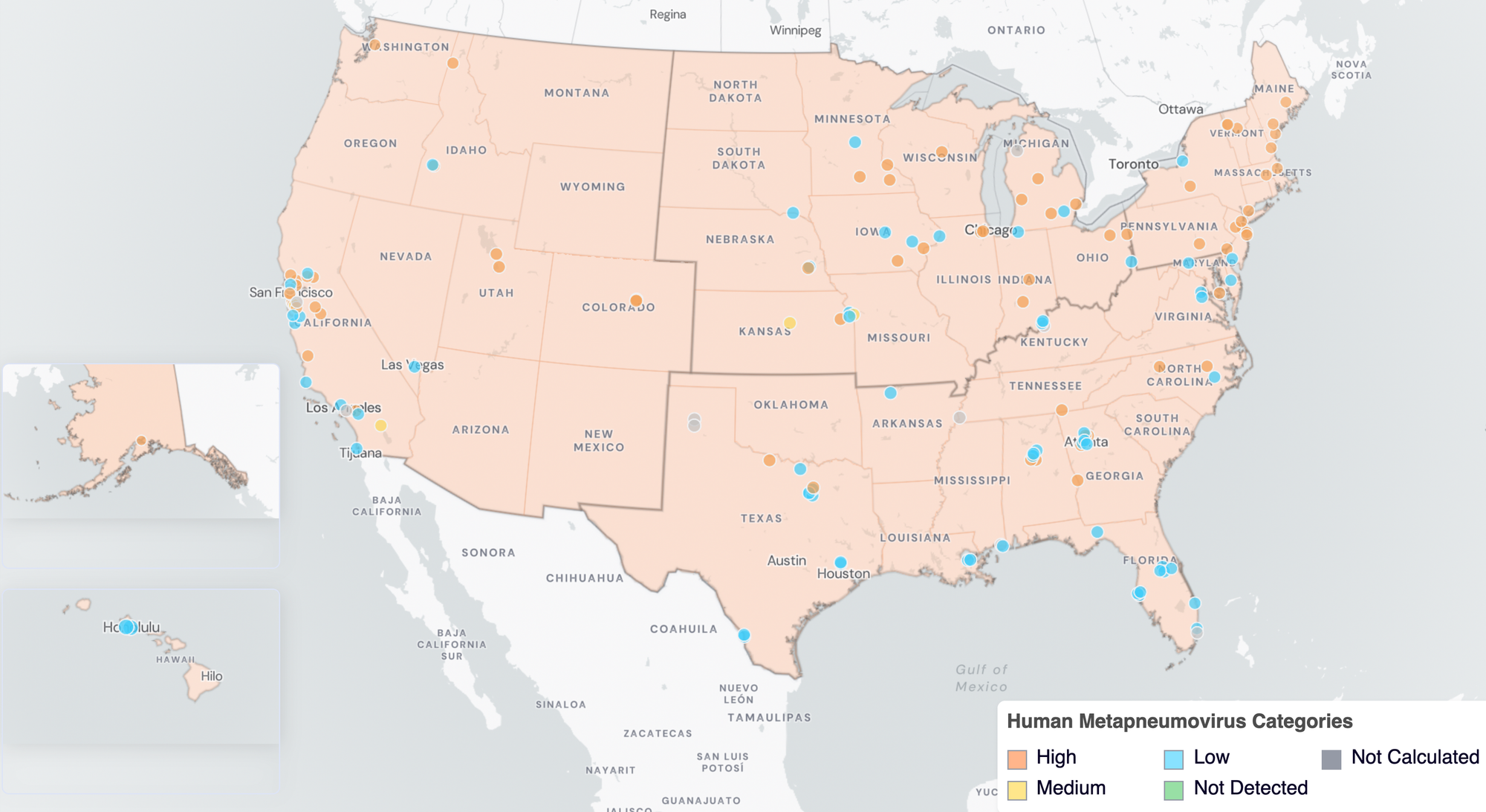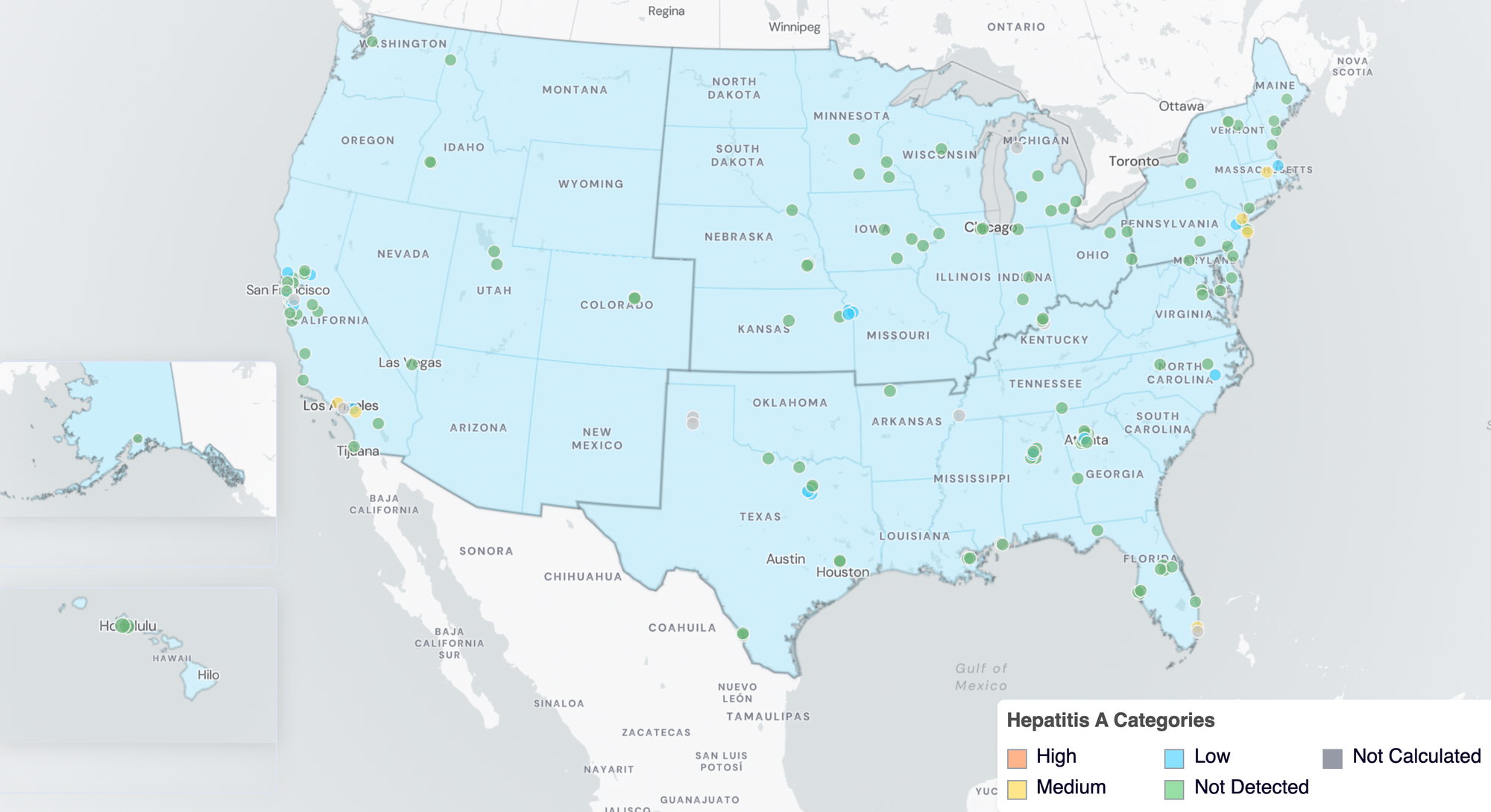 Since monitoring began, 43 sites across 21 states (AK, CA, CO, CT, FL, GA, IA, ID, IL, IN, KS, MD, MI, MN, NE, NJ, NV, NY, TX, UT and VT) have had at least 1 positive detection of MeV in wastewater samples collected. Below is a map of sites with MeV detections in wastewater since prospective monitoring began.