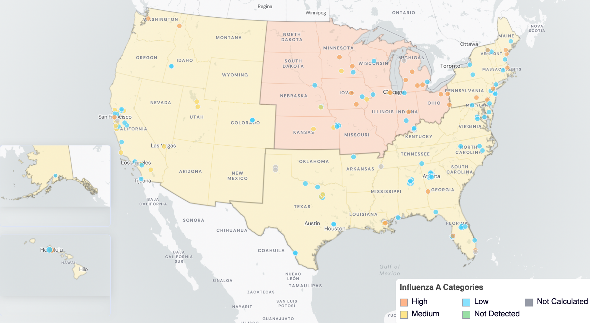Influenza A Wastewater Categories. This map includes sample collection data through March 30, 2026. Each dot represents a single site and the four US Census regions are outlined in gray. Midwest Region includes: IA, IL, IN, KS, MI, MN, NE, OH, SD, WI. Northeast Region includes: CT, MA, ME, NH, NJ, NY, PA, VT. Southern Region includes: AL, AR, DE, FL, GA, KY, LA, MD, MS, NC, TN, TX, VA, and WV. Western Region includes: AK, CA, CO, HI, ID, NV, UT, WA.