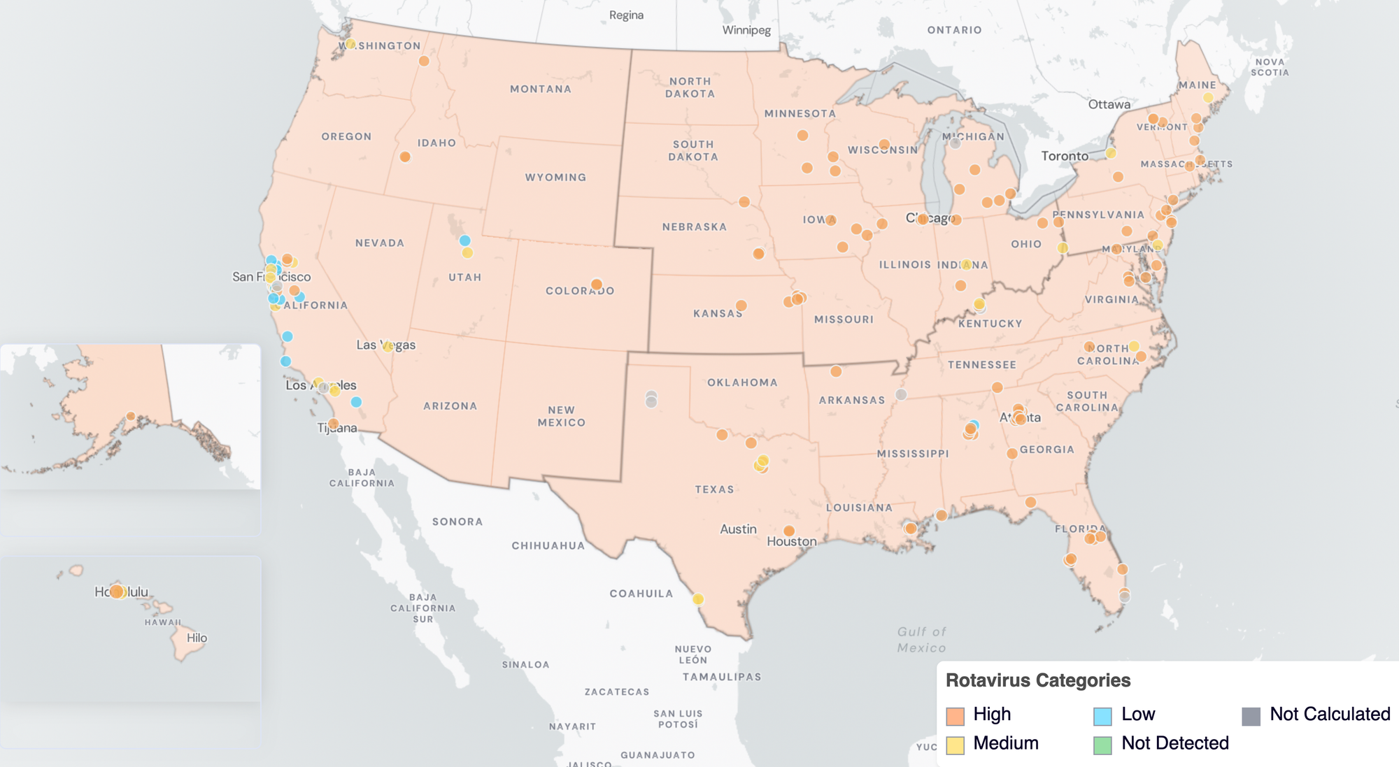 Rotavirus Wastewater Categories. This map includes sample collection data through March 30, 2026. Each dot represents a single site and the four US Census regions are outlined in gray. Midwest Region includes: IA, IL, IN, KS, MI, MN, NE, OH, SD, WI. Northeast Region includes: CT, MA, ME, NH, NJ, NY, PA, VT. Southern Region includes: AL, AR, DE, FL, GA, KY, LA, MD, MS, NC, TN, TX, VA, and WV. Western Region includes: AK, CA, CO, HI, ID, NV, UT, WA.