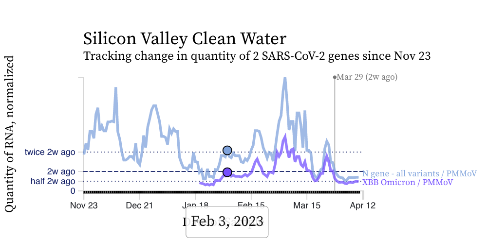 SARS-CoV-2 N gene concentrations at SCAN sites are similar to what they were two weeks ago. Concentrations are approximately between 100,000 copies per gram and 500,000 copies/g, still well above our lower detection limit of approximately 1,000 copies/g. Below is a chart showing data from the Silicon Valley Clean Water plant in San Mateo showing similar concentrations in the N gene concentration (blue line) relative to two weeks ago.