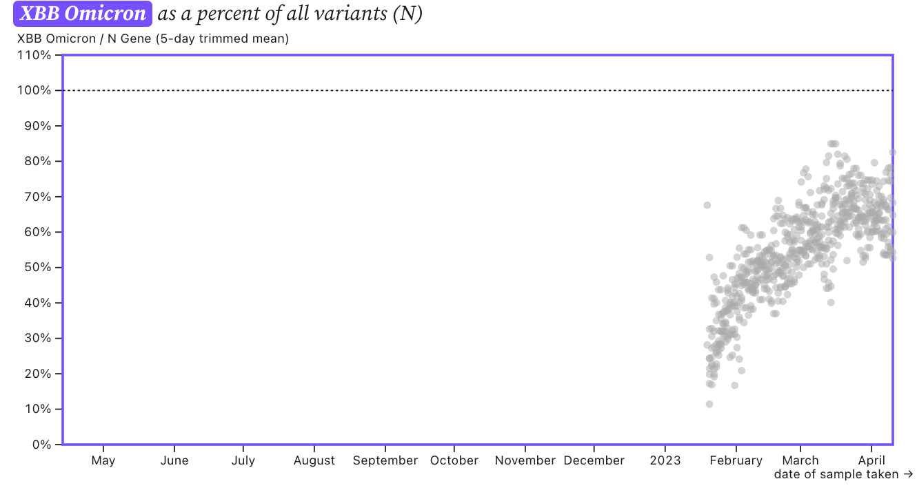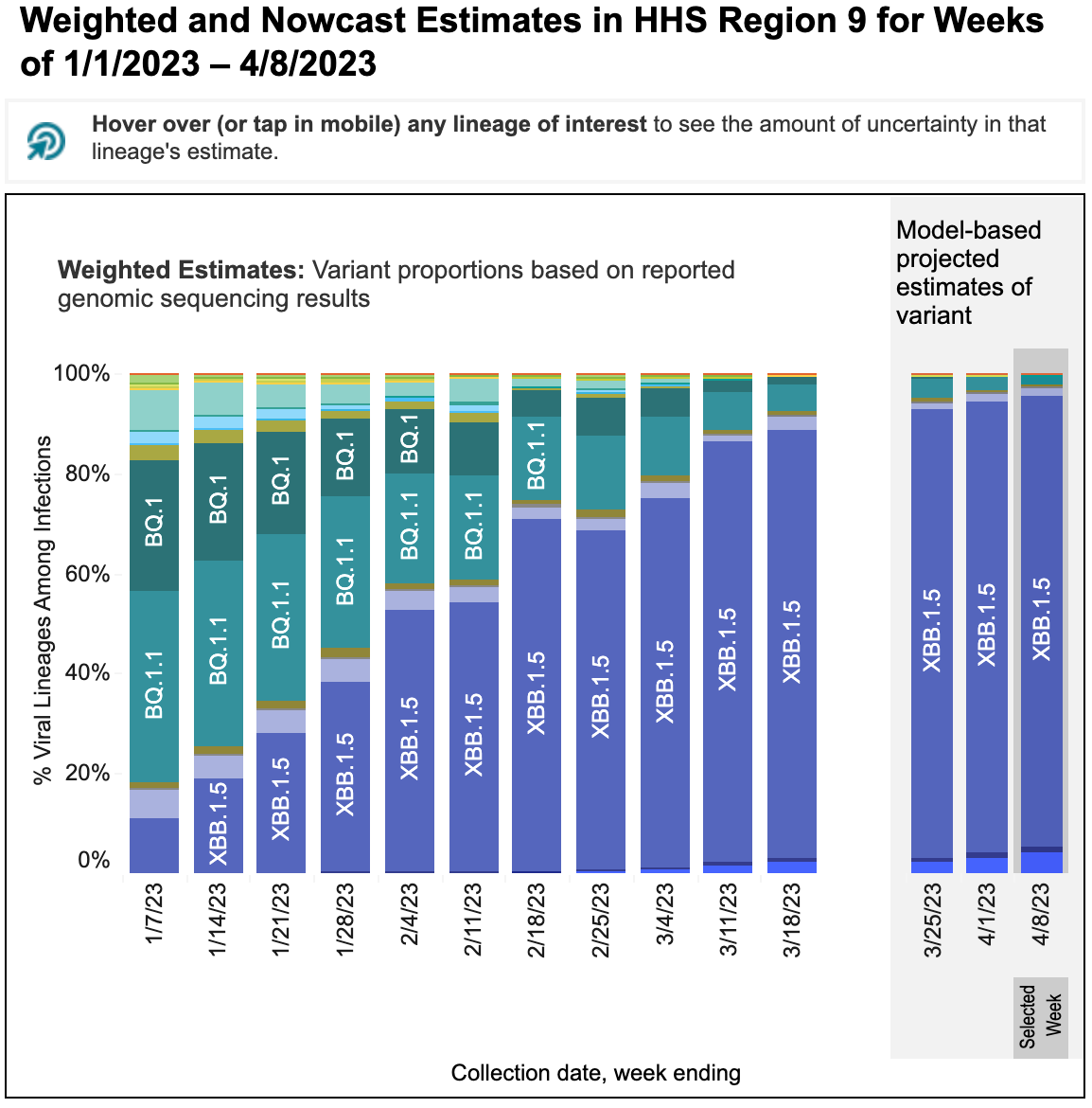 These data from wastewater solids on SARS-CoV-2 variants is consistent with the results from the CDC Nowcast for HHS region 9 (which includes CA). The nowcast suggests nearly all infections in HHS region 9 are caused by XBB* and <5% by BQ* (see screen shot from website below). These model projections for XBB* are higher than what we see in the wastewater. It is important to note that the clinical sample sequencing data used to make the CDC nowcast charts is only available as recently as a month ago (week of 3/18/23 in the chart below) and the rest of the data are model-based predictions. XBB.1.16 is not showing up in the nowcast yet.