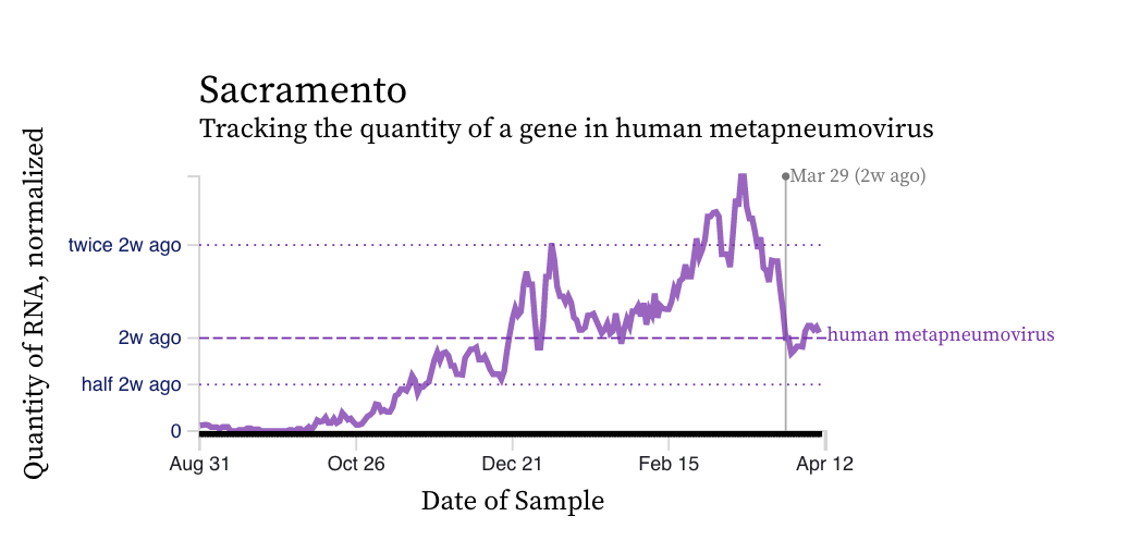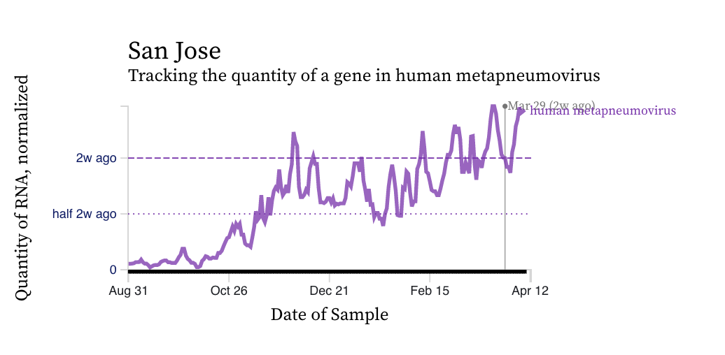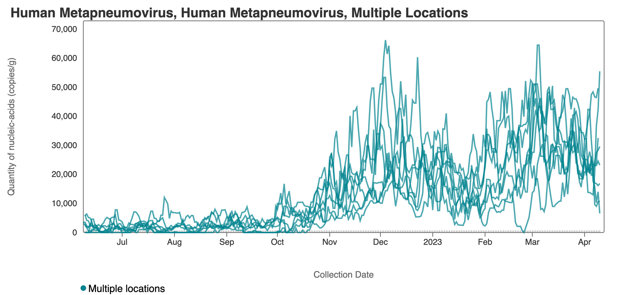HMPV (human metapneumovirus) RNA concentrations trends are variable across plants. Concentrations are between 10,000 and 100,000 copies/g dry weight. Below are charts showing data from all the SCAN plants together (link here to this chart if you want to interact with it), and just San Jose (increasing trend, relatively high levels), and just Sacramento (decreasing trend, decreasing levels). The pattern here is quite distinct from influenza and RSV and suggests this virus is still circulating in the communities.