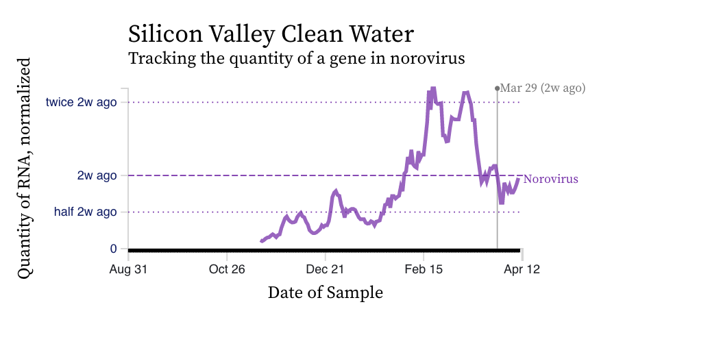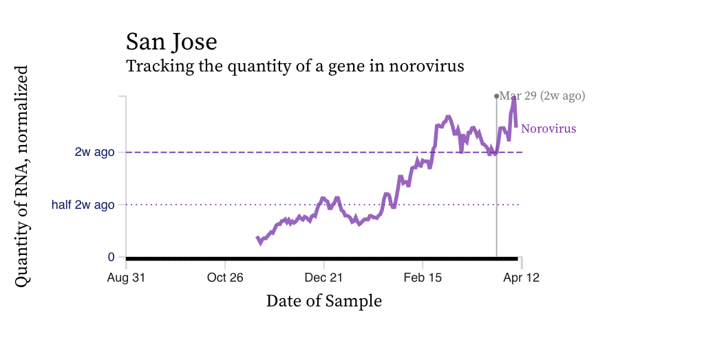 Norovirus GII RNA concentrations have taken a down turn at most plants, but San Jose is being stubborn and is still high. A chart of all the SCAN plants together is shown below, and then just San Jose where we have seen some recent high concentrations, and then just Silicon Valley Clean Water where concentrations have begun to decrease. You can interact with the chart of all the plants at this link.