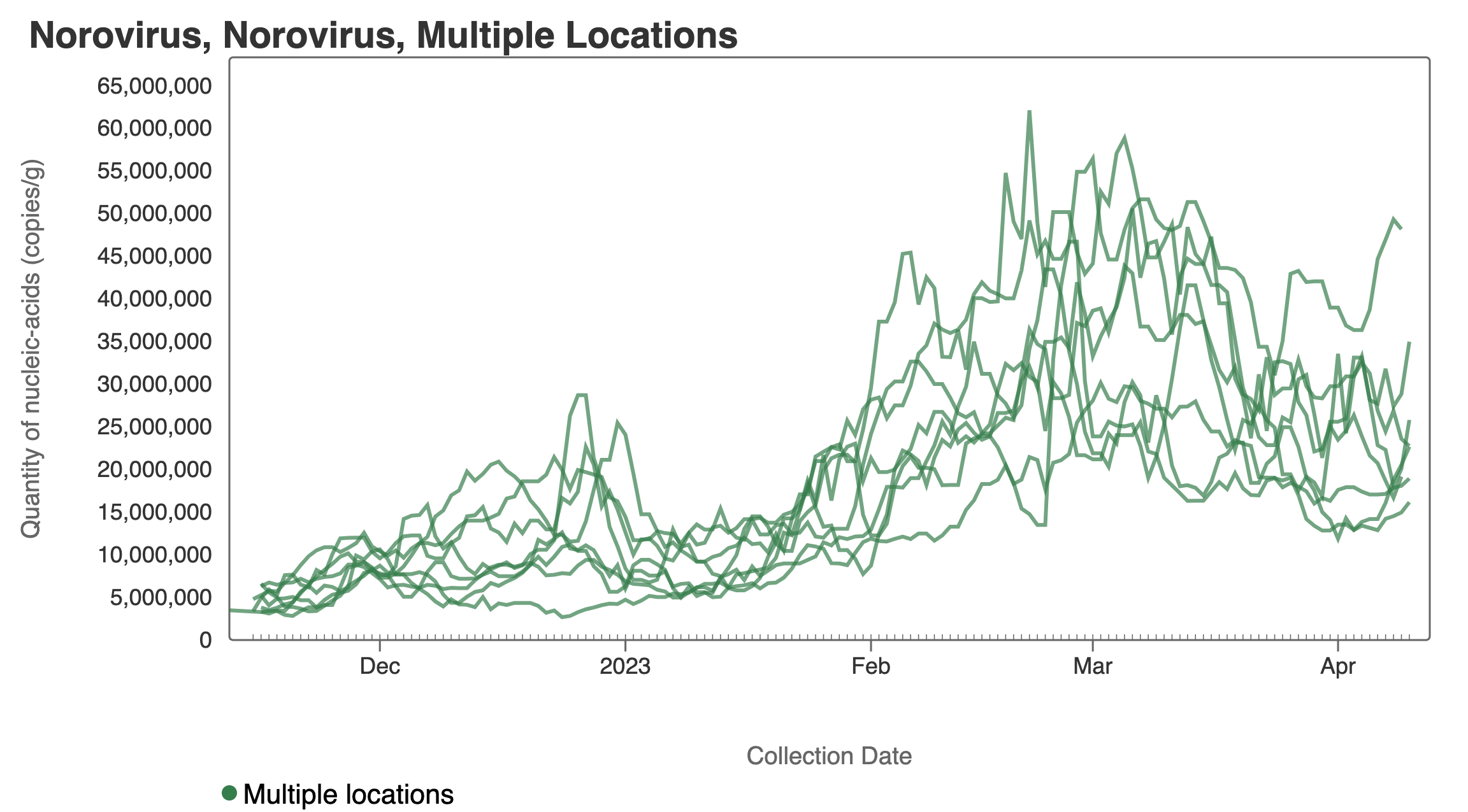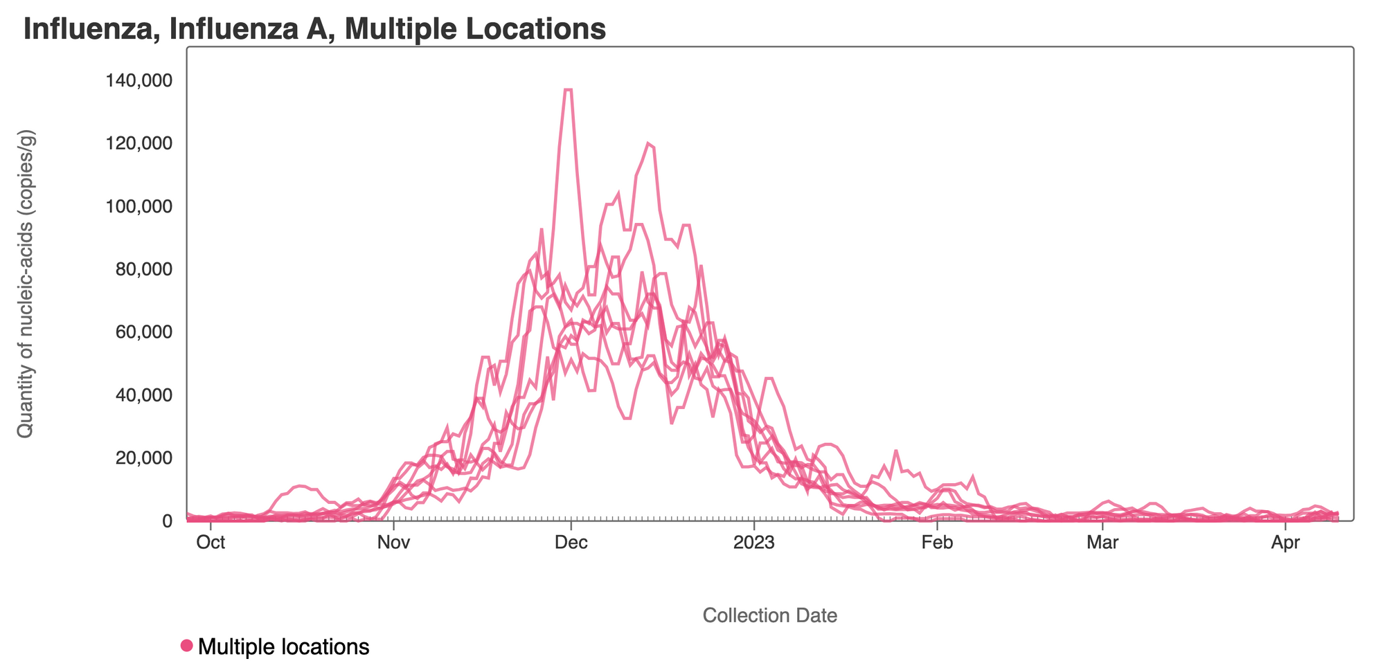 Influenza A (IAV) RNA concentrations remain low across the plants. Concentrations are generally non-detects in samples from recent weeks. The link to the chart is here if you would like to interact with it.
