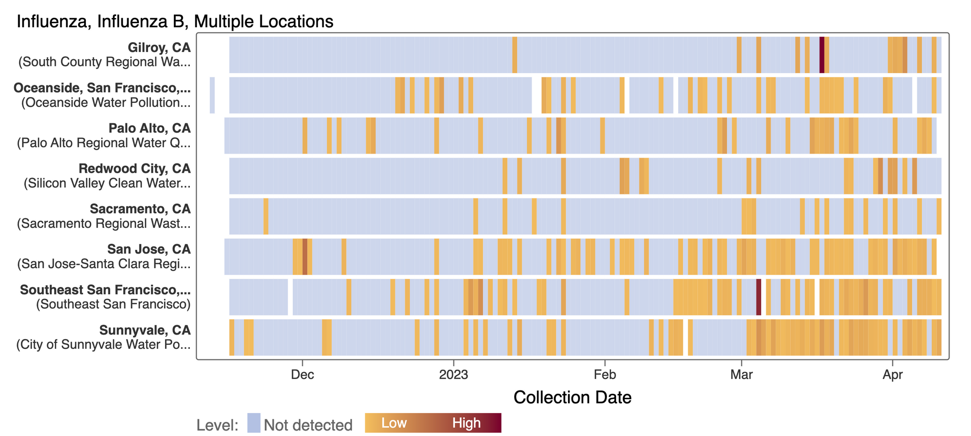 Influenza B (IBV) RNA continues to be sporadically detected at low concentrations at the SCAN plants. Each plant is represented by a row (y-axis), and dates are shown along the x-axis. Blue indicates a non-detect, and darker orange/red is proportional to concentration with the highest values being darkest. A white means no sample was collected. Here is the link to the heat map chart - the linked chart will update automatically as more data are added to the site.