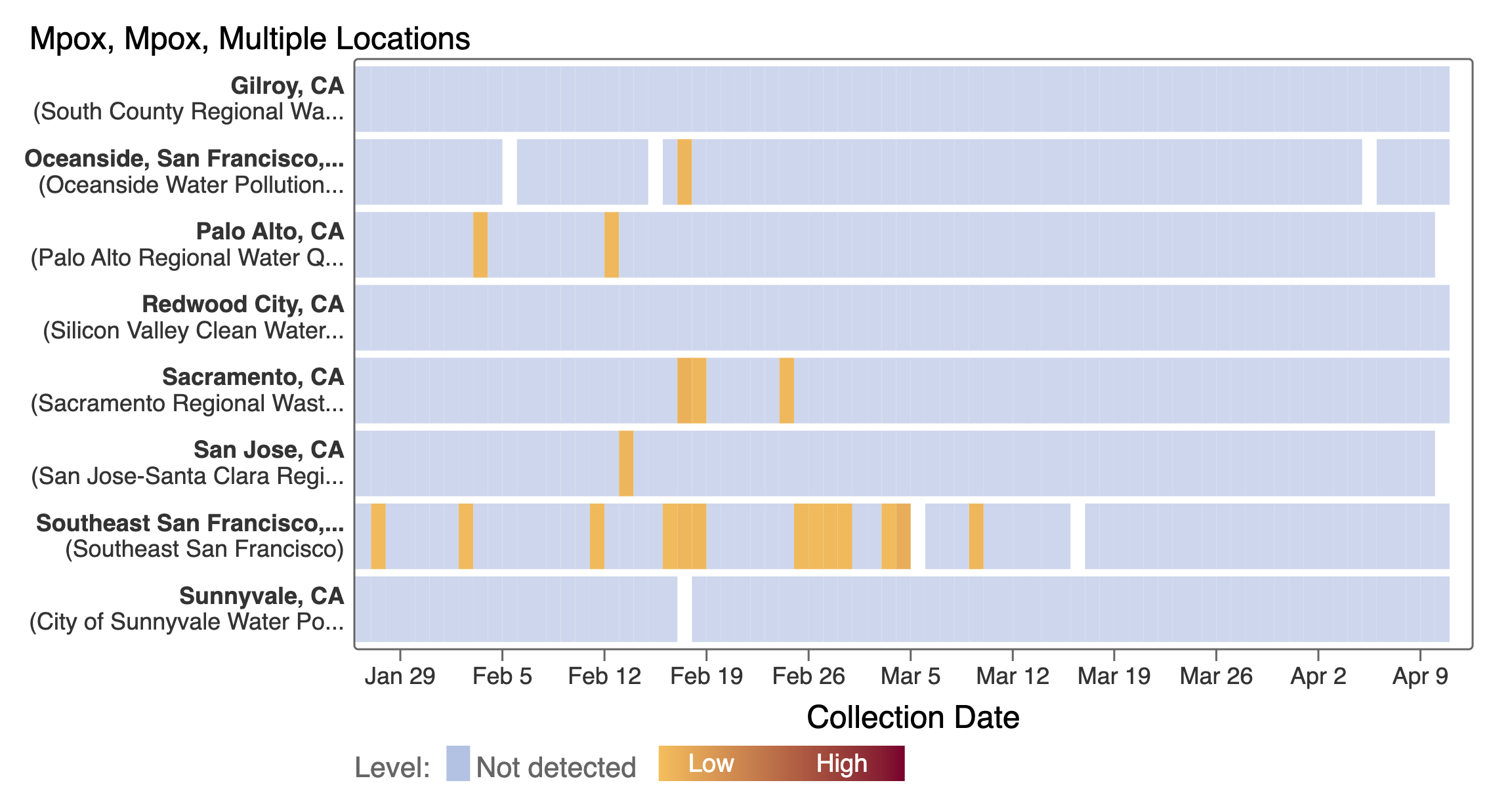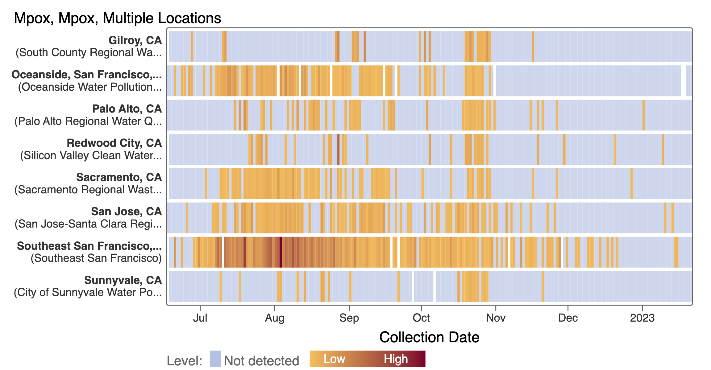 We've observed non-detects in the past two weeks for MPXV DNA at the SCAN plants. These heat maps show all the SCAN sites as a row, and each date as a column. The color blue means the sample was non-detect for MPXV DNA and the colors get darker with higher concentrations. The top chart shows just recent data, and the bottom one all the data we have collected, almost a year's worth of data. The charts highlight that we have no thad MPXV DNA detections since early March at the SCAN plants. You can access these plots here.