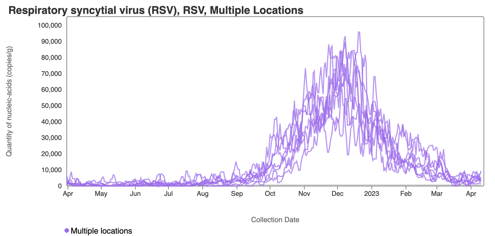 RSV RNA has been non-detectable in some samples from some plants over the last week with some low level detections. This plot shows data from all the SCAN sites together since April 2022 and can be access here.