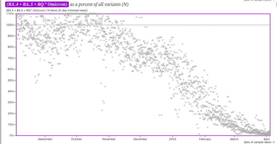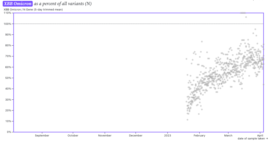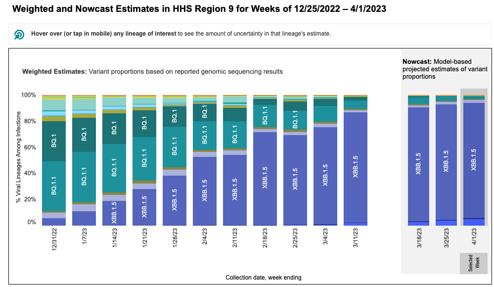 These data from wastewater solids on SARS-CoV-2 variants is consistent with the results from the CDC Nowcast for HHS region 9 (which includes CA). The nowcast suggests nearly all infections in HHS region 9 are caused by XBB* and <5% by BQ* (see screen shot from website below). These model projections for XBB* are higher than what we see in the wastewater. It is important to note that the clinical sample sequencing data used to make the CDC nowcast charts is only available as recently as a month ago (week of 3/11/23 in the chart below) and the rest of the data are model-based predictions.