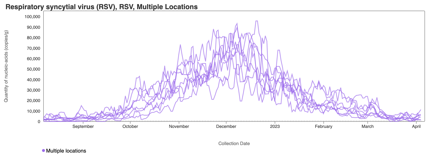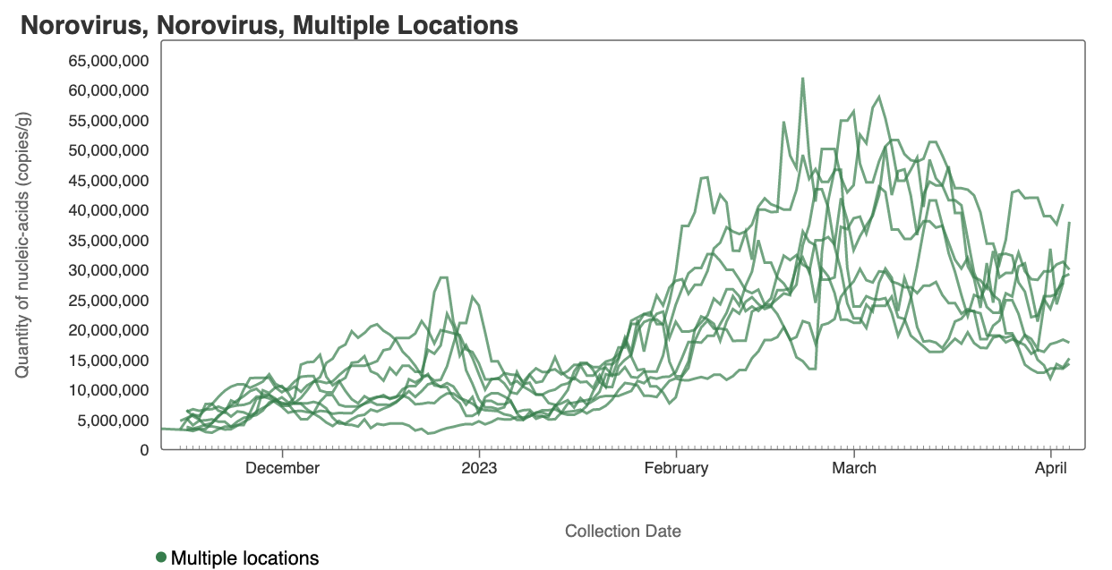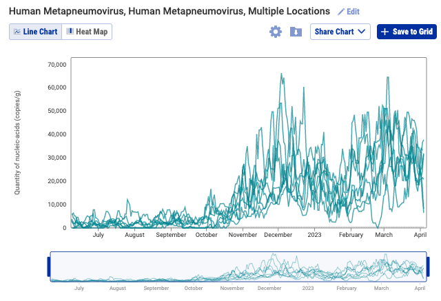 RSV RNA has been non-detectable in some samples from some plants over the last week with some low level detections. This plot shows data from all the SCAN sites together since August 2022 and can be access here. The number of individuals shedding RSV into the wastewater has decreased substantially.