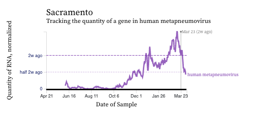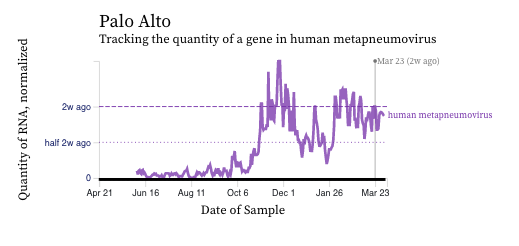 HMPV (human metapneumovirus) RNA concentrations trends are variable across plants. Concentrations are between 10,000 and 100,000 copies/g dry weight. Below are charts showing data from all the SCAN plants together (link here to this chart if you want to interact with it), and just Palo Alto (no trend, relatively high levels), and just Sacramento (decreasing trend, decreasing levels). The pattern here is quite distinct from influenza and RSV and suggests this virus is still circulating in the communities.