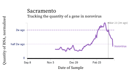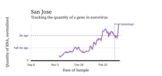 Norovirus GII RNA concentrations have taken a down turn at some plants, but shown recent increases at others. A chart of all the SCAN plants together is shown below, and then just San Jose where we have seen some recent high concentrations, and then just Sacramento where concentrations have begun to decrease. You can interact with the chart of all the plants at this link.