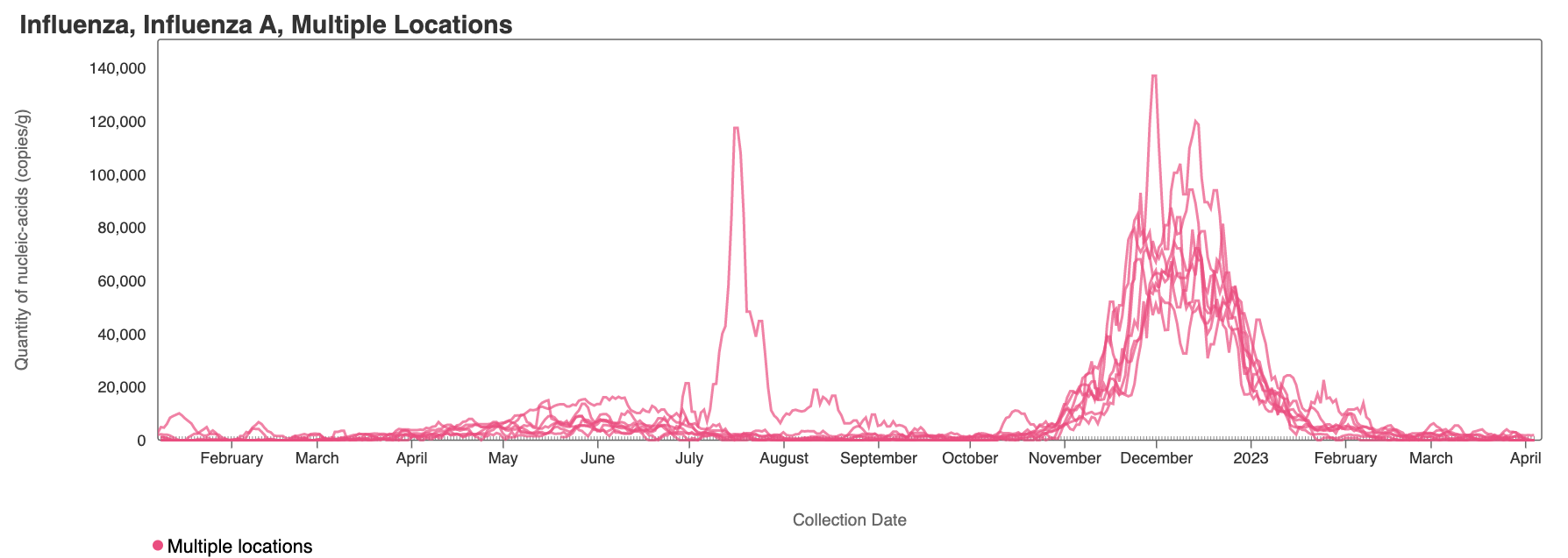 Influenza A (IAV) RNA concentrations have dropped across the plants. Concentrations are generally non-detects in samples from recent works. Influenza A RNA appears to no longer be shed into the wastewater in the SCAN plants. The link to the chart is here if you would like to interact with it.