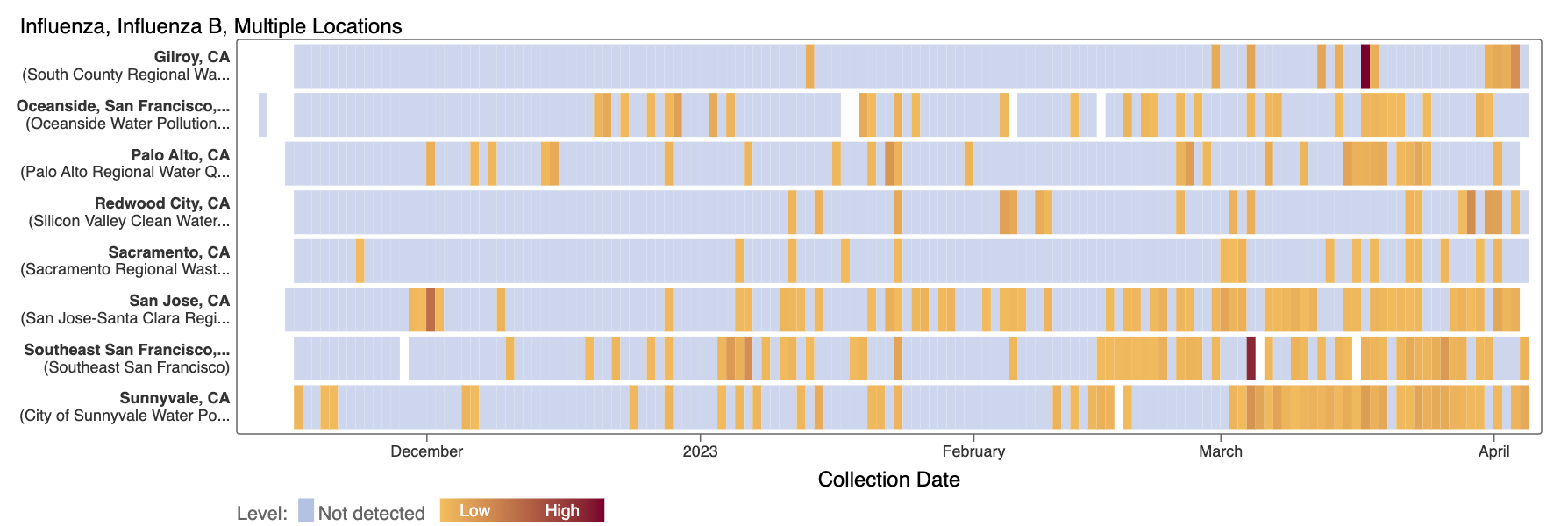 Influenza B (IBV) RNA continues to be sporadically detected at low concentrations at the SCAN plants. Each plant is represented by a row (y-axis), and dates are shown along the x-axis. Blue indicates a non-detect, and darker orange/red is proportional to concentration with the highest values being darkest. A white means no sample was collected. Here is the link to the heat map chart - the linked chart will update automatically as more data are added to the site.
