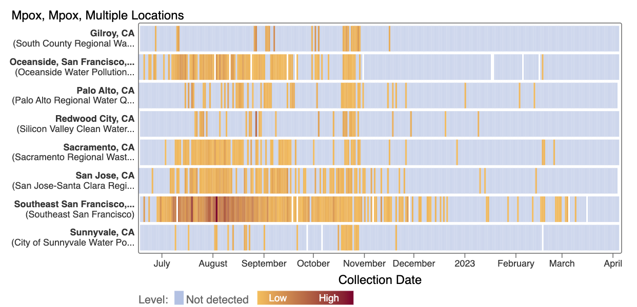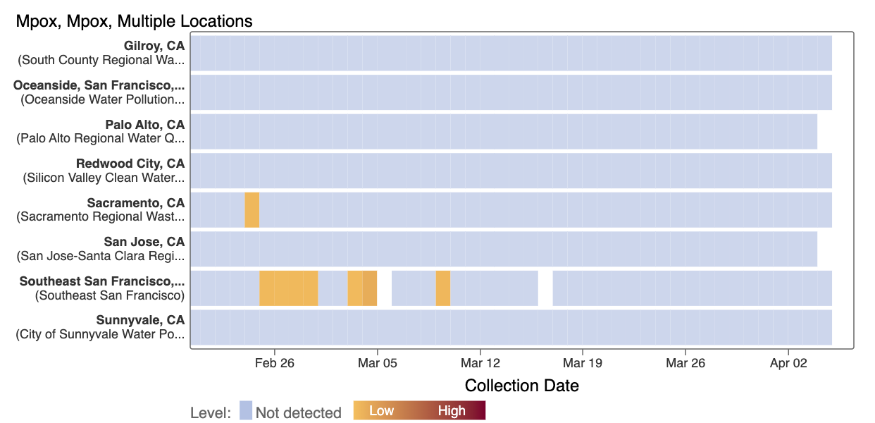 We've observed non-detects in the past two weeks for MPXV DNA at the SCAN plants. These heat maps show all the SCAN sites as a row, and each date as a column. The color blue means the sample was non-detect for MPXV DNA and the colors get darker with higher concentrations. The top chart shows just recent data, and the bottom one all the data we have collected, almost a year's worth of data. The charts highlight that we rarely have detections of MPXV DNA at these SCAN plants recently, but we can see how we had much more in the past. You can access this plot here.