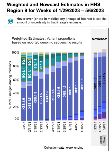 These data from wastewater solids on SARS-CoV-2 variants are consistent with the results from the CDC Nowcast for HHS Region 9 (which includes CA). The nowcast suggests nearly all infections in HHS Region 9 are caused by XBB*. 10% of infections are modeled to be caused by XBB.1.16 this week. A new XBB* (XBB.1.5.15, also called FD.2) is modeled to be causing 5% of infections this week.