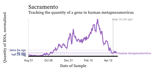 HMPV (human metapneumovirus) RNA concentrations are coming down across most of plants in SCAN. Below are charts showing data from all the SCAN plants together (link here to this chart if you want to interact with it), and just Sacramento and San Jose. At Sacramento and San Jose levels have come down quite a bit over the last week.