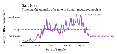 The 2-week look period trend analysis on HMPV RNA at these plants indicates a significant downward trend at San Jose and no trend at the remaining plants.
