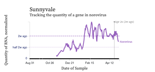 Norovirus GII RNA concentrations have taken a down turn at most, but not all plants. A chart of all the SCAN plants together is shown below. The population weighted average line is shown in black, and that line shows a slow decrease over the last couple weeks. You can interact with the chart of all the plants at this link. The chart from Sunnyvale shows that norovirus RNA concentrations have been fairly constant over the last two weeks, and other individual plants have similar patterns.