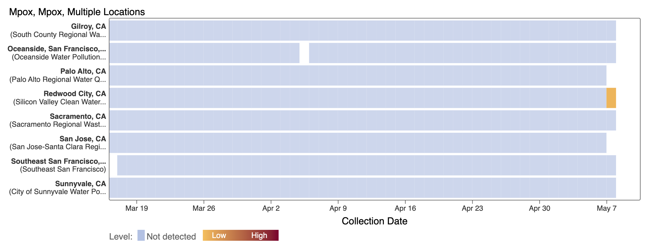 We've observed non-detects in the last 6 weeks for MPXV DNA at the SCAN plants, with the exception of a recent sample (show in orange below). These heat maps show all the SCAN sites as a row, and each date as a column. The color blue means the sample was non-detect for MPXV DNA and the colors get darker with higher concentrations. The top chart shows just recent data, and the bottom one all the data we have collected, almost a year's worth of data. You can access these plots here.