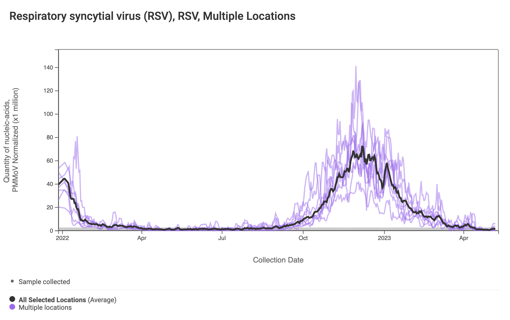 RSV RNA has been non-detectable in most samples in the past week. This plot shows data from all the SCAN sites together since last winter and can be access here. The black line is the population weighted average.