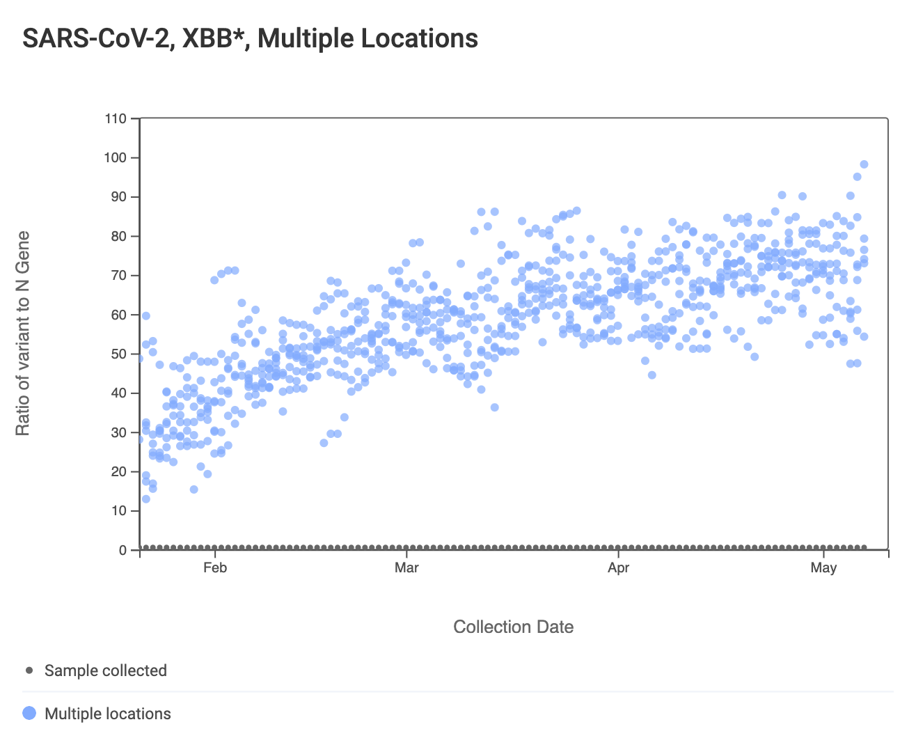 The chart from San Jose (2 plots above) shows that the mutation marker for XBB* (shown in violet) is close to the blue line (showing the N gene, present in all variants), and the bright purple line (showing the mutation present in the BQ* and BA.5 sublineages) is basically at 0. This indicates that most of the individuals shedding SARS-CoV-2 RNA in the sewersheds are infected with and shedding XBB* rather than another variant. We see the pattern across all the sewersheds in SCAN. The assay we use for XBB* detects XBB.1.16 as well as XBB.1.9 and FD.2 which are emerging XBB*. We are consistently detecting XBB.1.16 in wastewater from the three plants we sequence SARS-CoV-2 from (Oceanside, San Jose, and Sacramento) using sequencing approaches. We do not have good precision on the proportion of SARS-CoV-2 genomes that are XBB.1.16, but perhaps between 10-20% in some samples. The data suggest that the sublineage is present, in the wastewater as of the last week of April. The sequencing data is a couple weeks delayed from the present time.