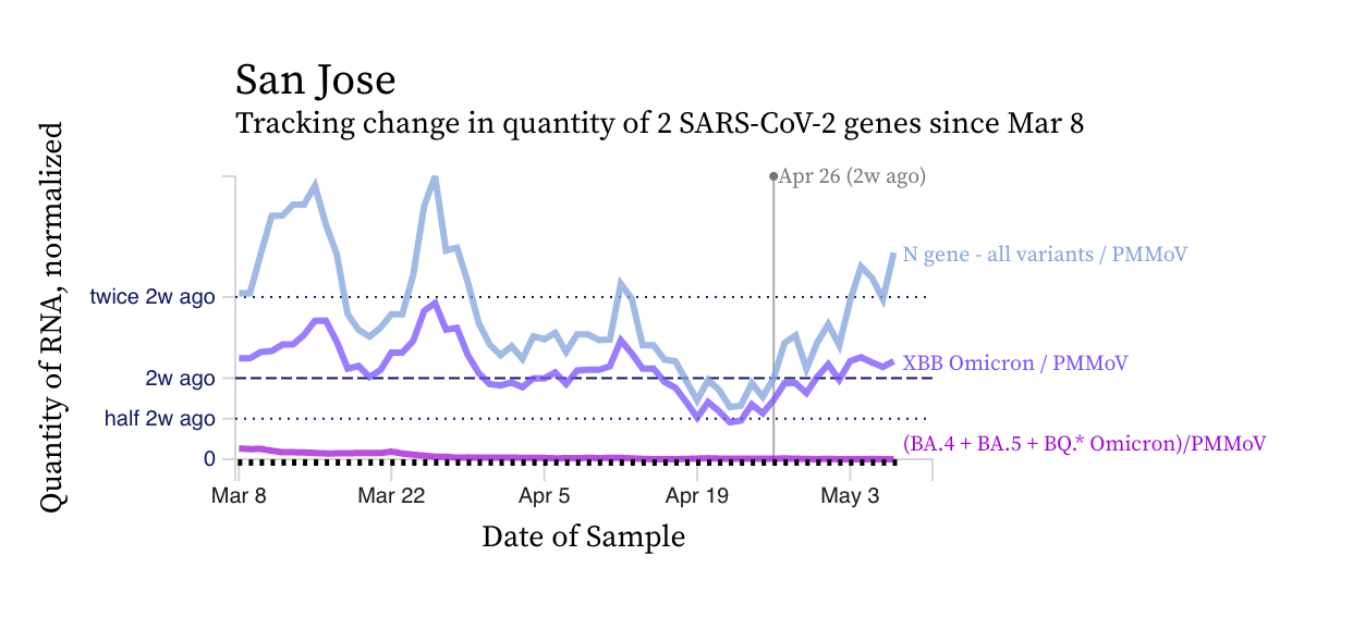 SARS-CoV-2 N gene concentrations at SCAN sites are similar to what they were two weeks ago at most sites, but are increasing at a subset. Concentrations are still approximately 100,000 copies/g, still well above our lower detection limit. Below is a chart showing data from the San Jose showing increases in N gene concentration (blue line) over the last two weeks.