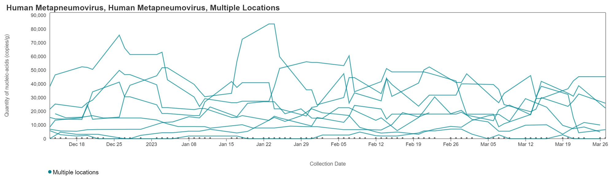 HMPV (human metapneumovirus) RNA concentrations have remained constant at a number of plants over the last 2 weeks. Overall, concentrations are less than 60,000 copies/g. Below are charts showing data from all the Georgia plants together (click the link here to this chart if you want to interact with it). Recent samples at the South River plant have concentrations that are not detectable.