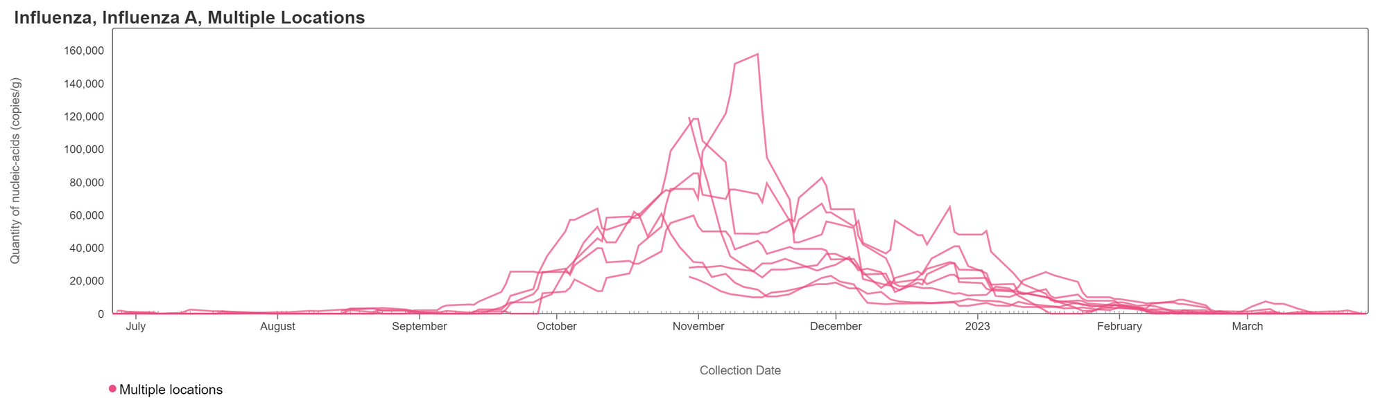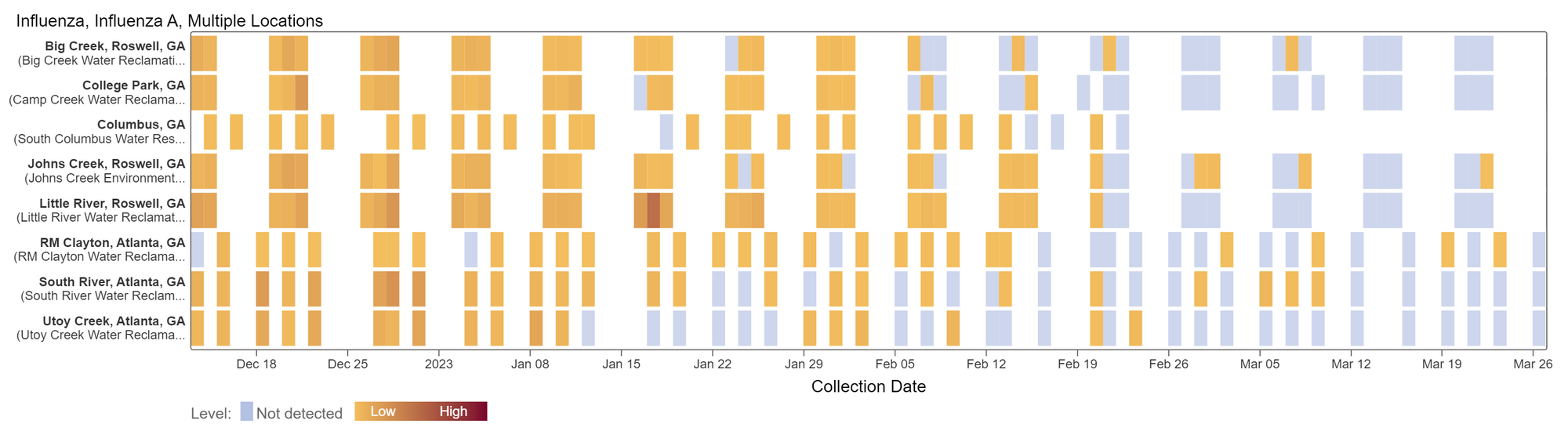 Influenza A (IAV) RNA concentrations have dropped significantly across all sites since peaking in November and December of 2022. Over the past two weeks, IAV was not detected in the majority of samples - this indicates that there are very few if any people shedding IAV RNA in wastewater in Georgia plants. When a sample is non-detect, it is possible that there is some RNA present but it is at levels below what our methods can detect. We've previously shown through our research that. The link to the chart is here if you would like to interact with it.