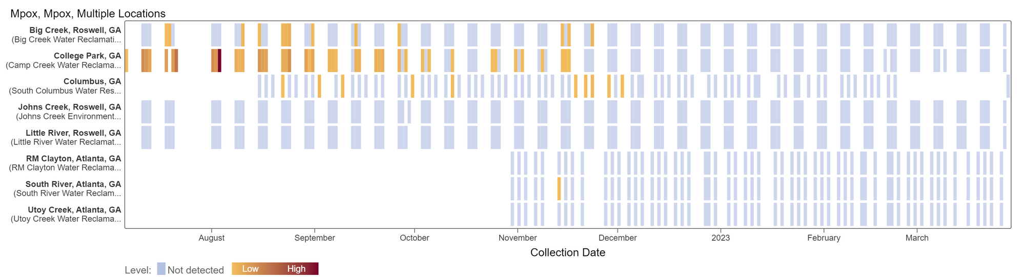 Results have been non-detect for mpox in all Georgia plants since Dec 2022. This heat map shows all the data we have collected for all Georgia sites as a row and each date as a column. Again, the color blue means the sample was non-detect for mpox DNA and the colors get darker with higher concentrations. Levels of mpox DNA in wastewater were high at a number of plants during the time period where there were also many cases identified in Georgia last year. You can access this plot here.