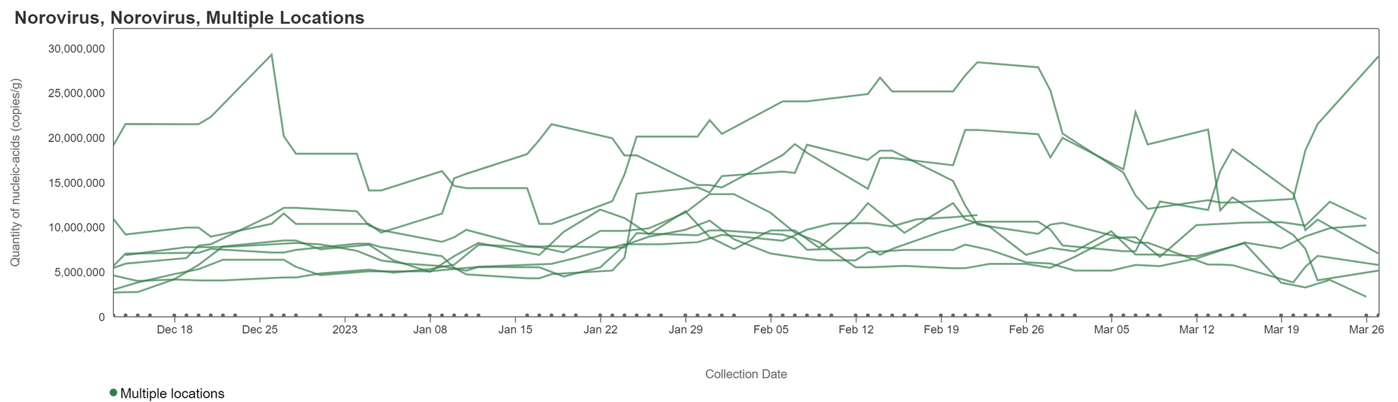Norovirus GII RNA concentrations have been relatively flat across sites for the past several weeks. Concentrations for Georgia plants are between 1,000,000 - 30,000,000 copies/gram. A chart of all the Georgia sites together is shown below. You can interact with the chart of all the plants at this link.
