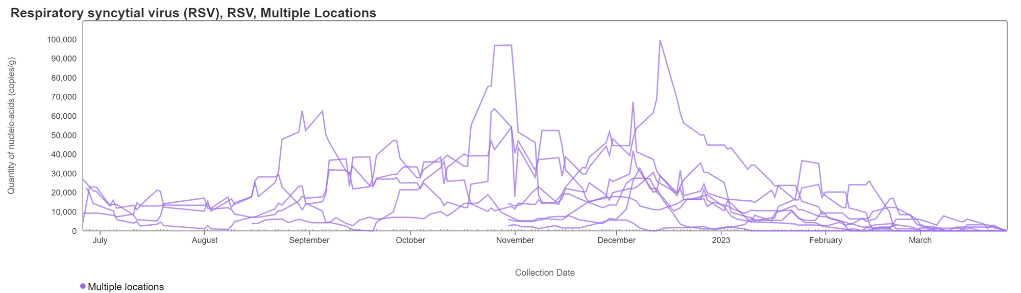 RSV RNA concentrations have begun to decrease over time with concentrations of less than 20,000 copies/gram at all sites for the last month. This plot shows data from all the Georgia sites together and can be accessed here. Similar to IAV, RSV has regularly not been detected in samples over the past two weeks.