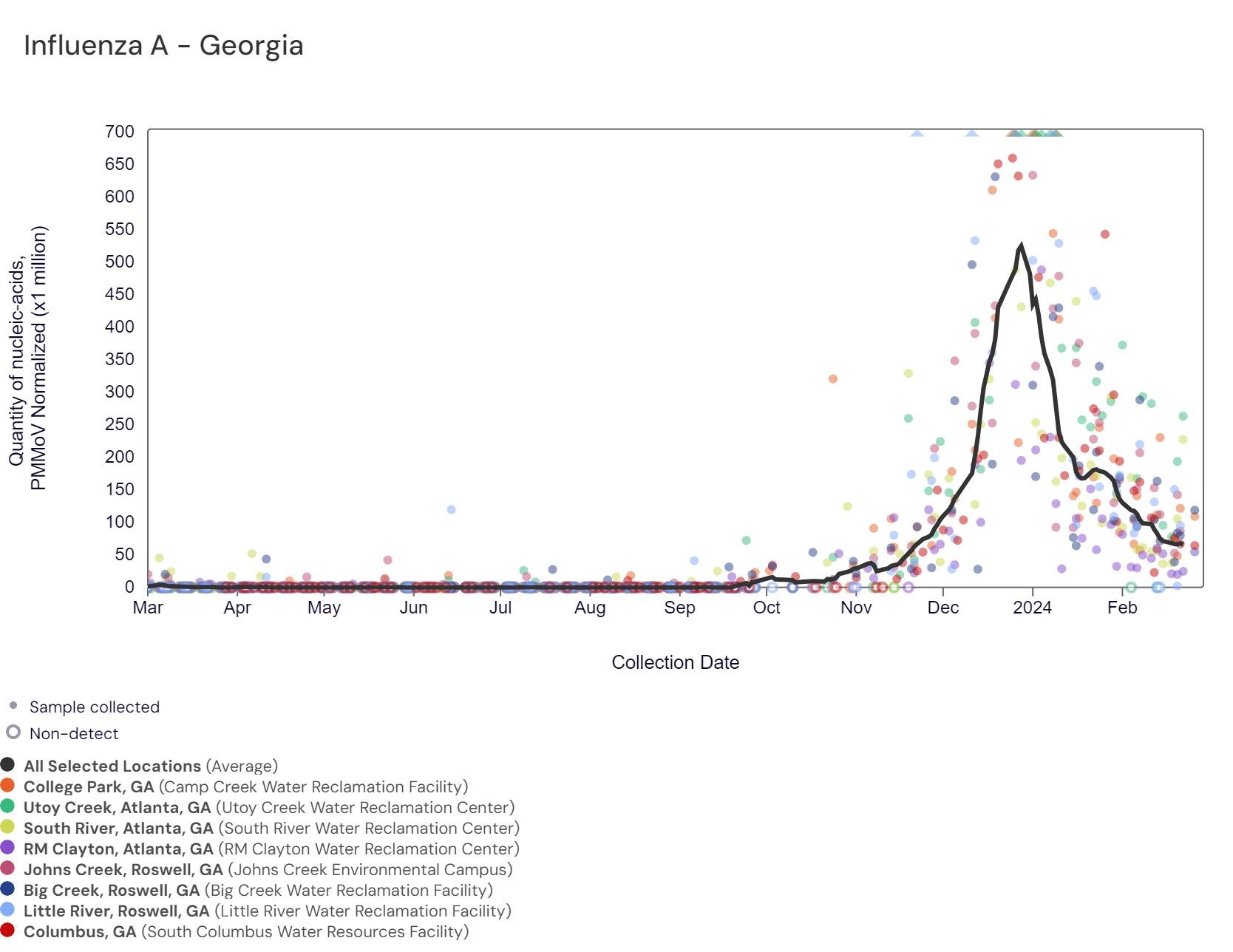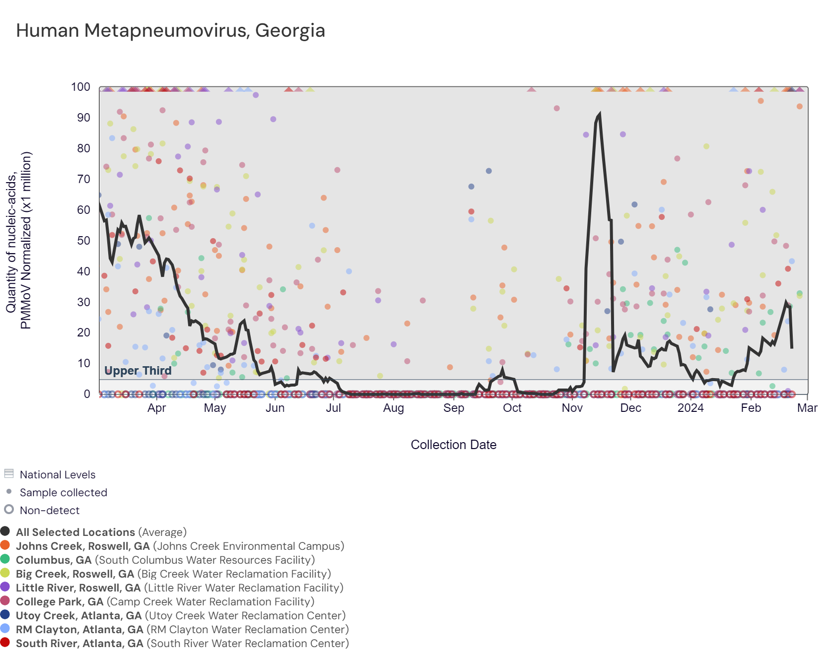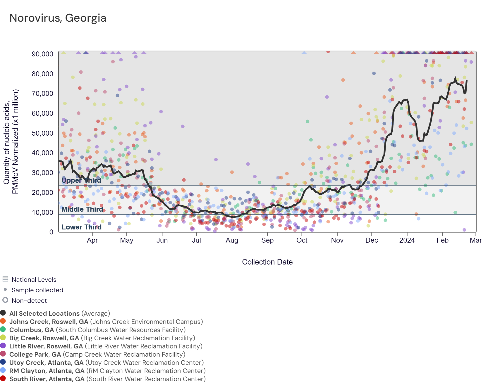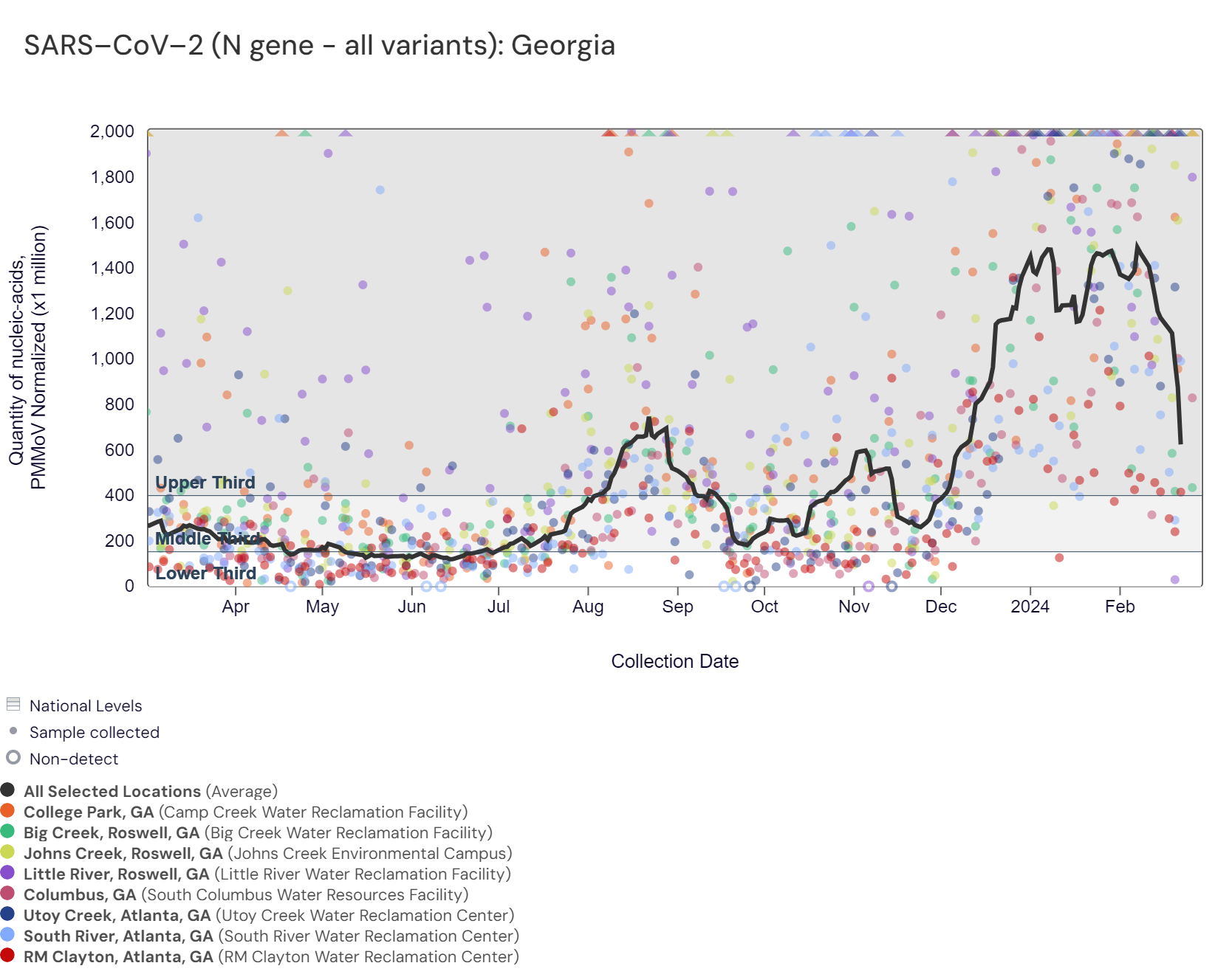 SARS-CoV-2 RNA concentrations have been between 79,000 and 780,000 copies/gram in the last two weeks. The chart below shows the raw data over the last 365 days and the population-weighted aggregated trend line for all 8 Georgia sites when the data is normalized by PMMoV. The aggregated line and the National Levels benchmarks illustrate that SARS-CoV-2 N gene RNA concentrations among Georgia sites are within the upper third level of all concentrations measured in the last year. As of 3/1/24, College Park, Columbus, Little River, Big Creek, and Johns Creek are in the HIGH (5 sites) Wastewater category. There was not enough data to calculate a category for RM Clayton, Utoy Creek, and South River (3 sites).