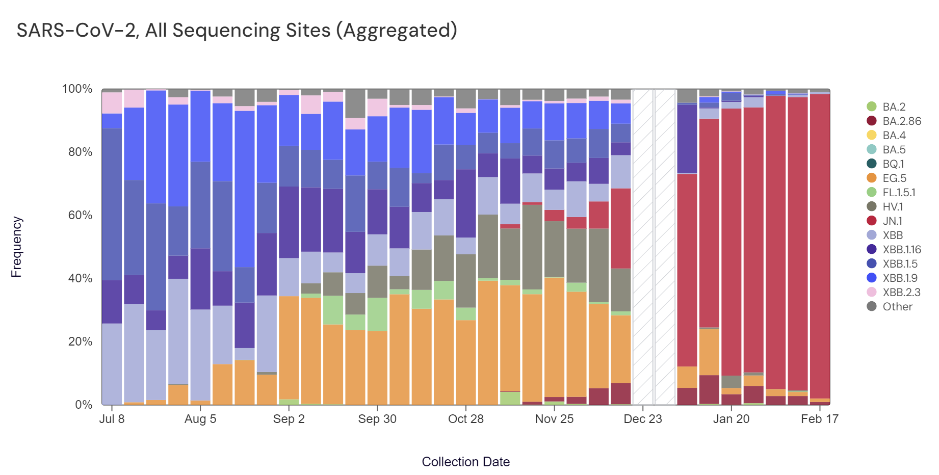 Sequencing data is now also available in aggregate across all sites in WWSCAN with sequencing data. That plot is shown below and also suggests that JN.1 is the most abundant variant across all sites (96.3%).