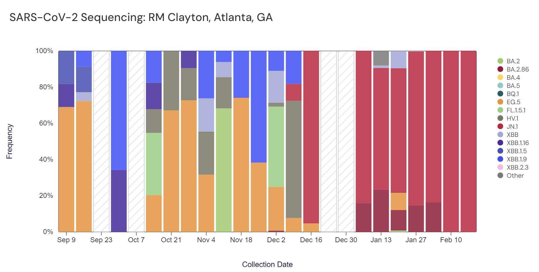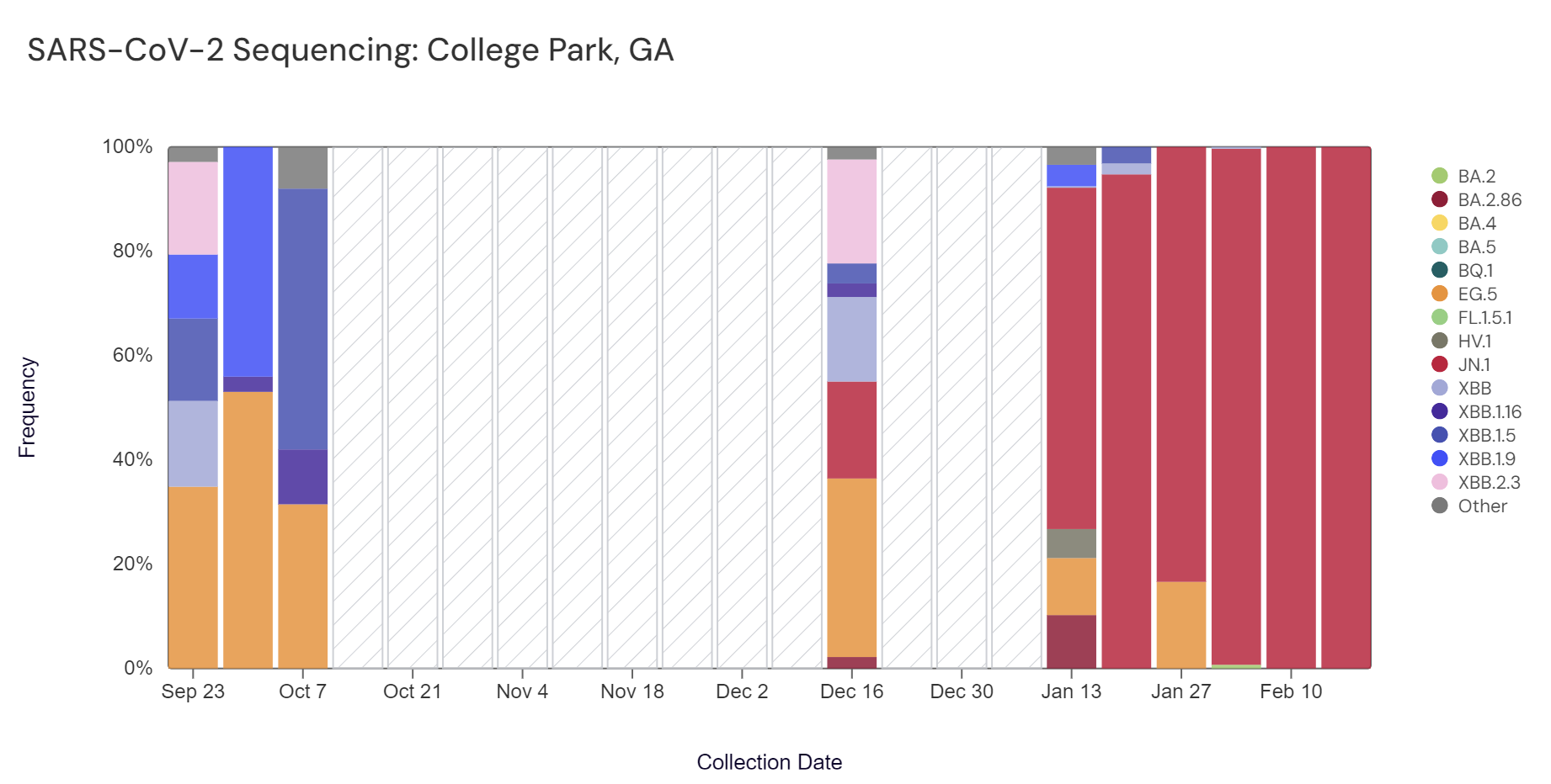 In the most recent samples, JN.1 (bright red) made up the largest proportion of the lineages detected at both sites (100% at RM Clayton, and 100% at College Park). Note that the most recent data are from two weeks ago (through Feb 17); sequencing data are always from samples taken between 1- 2 weeks ago.