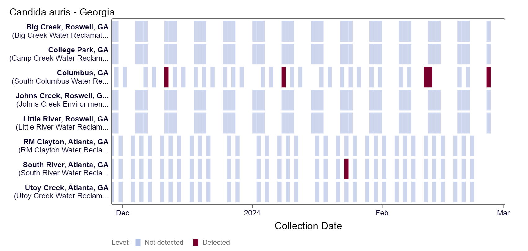 Candida auris DNA has only been detected at the Columbus site in the last two weeks, based on the heat map below. College Park, Columbus, Little River, Big Creek, and Johns Creek are in the LOW (5 sites) Wastewater Category, as of 3/1/24. There was not enough data to calculate a category for RM Clayton, Utoy Creek, and South River (3 sites).
