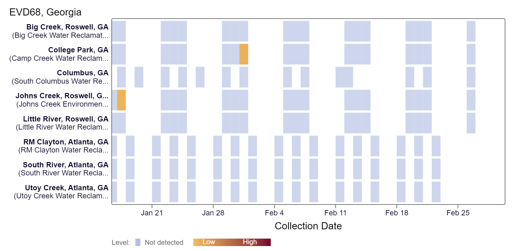 EV-D68 RNA is rarely detected at Georgia sites. Over the last two weeks, EV-D68 has not been detected, according to the heat map below. As a reminder, the color blue means the sample was non-detect for EV-D68 RNA and the colors get darker with higher concentrations. As of 3/1/24, College Park, Columbus, Little River, Big Creek, and Johns Creek are in the HIGH (5 sites) Wastewater category. There was not enough data to calculate a category for RM Clayton, Utoy Creek, and South River (3 sites).