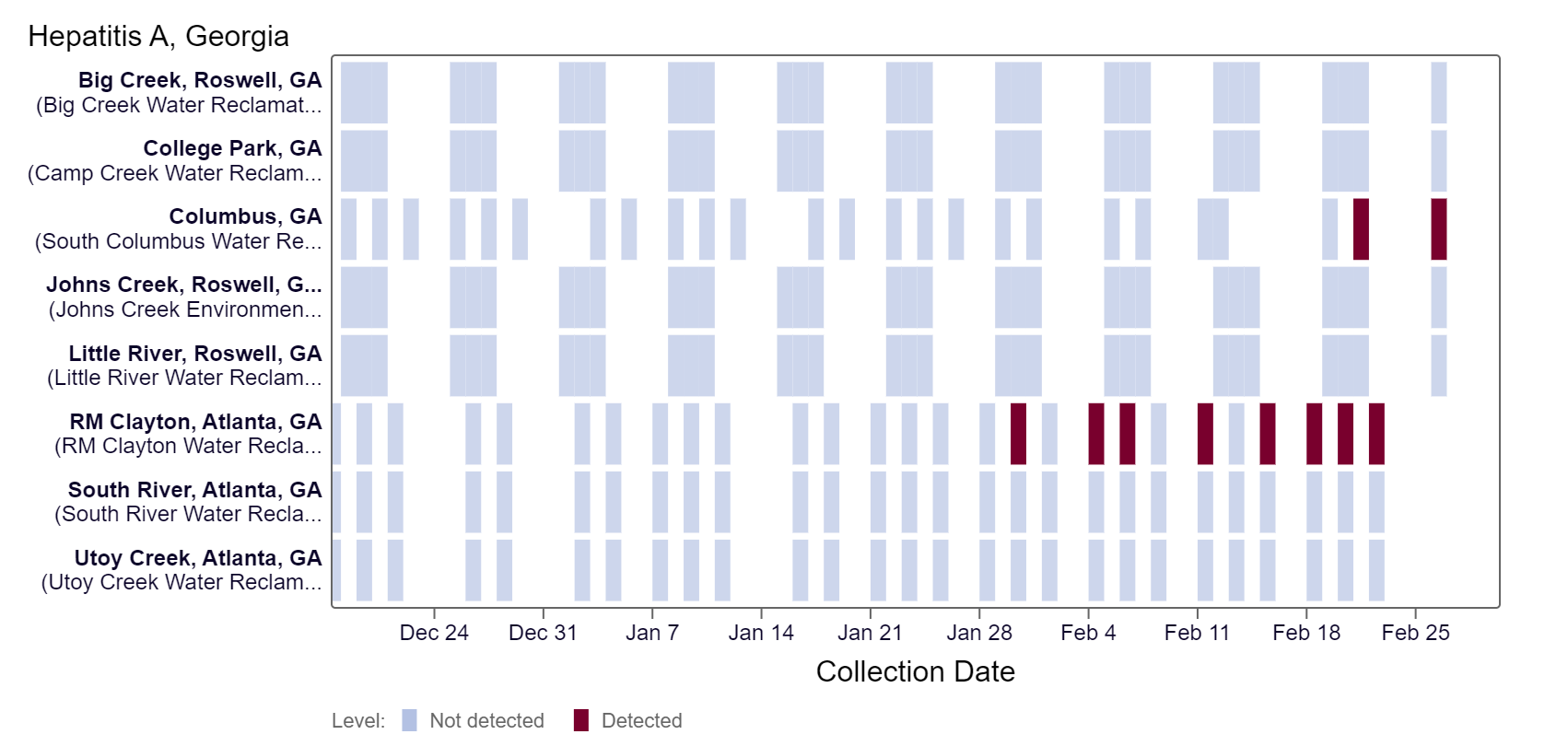 Hepatitis A RNA has been detected in samples collected from Columbus and RM Clayton over about the last two weeks, according to the heat map. As of 3/1/24, Columbus is in the MEDIUM (1 site) Wastewater Category. College Park, Little River, Big Creek, and Johns Creek are in the LOW (4 sites) category.