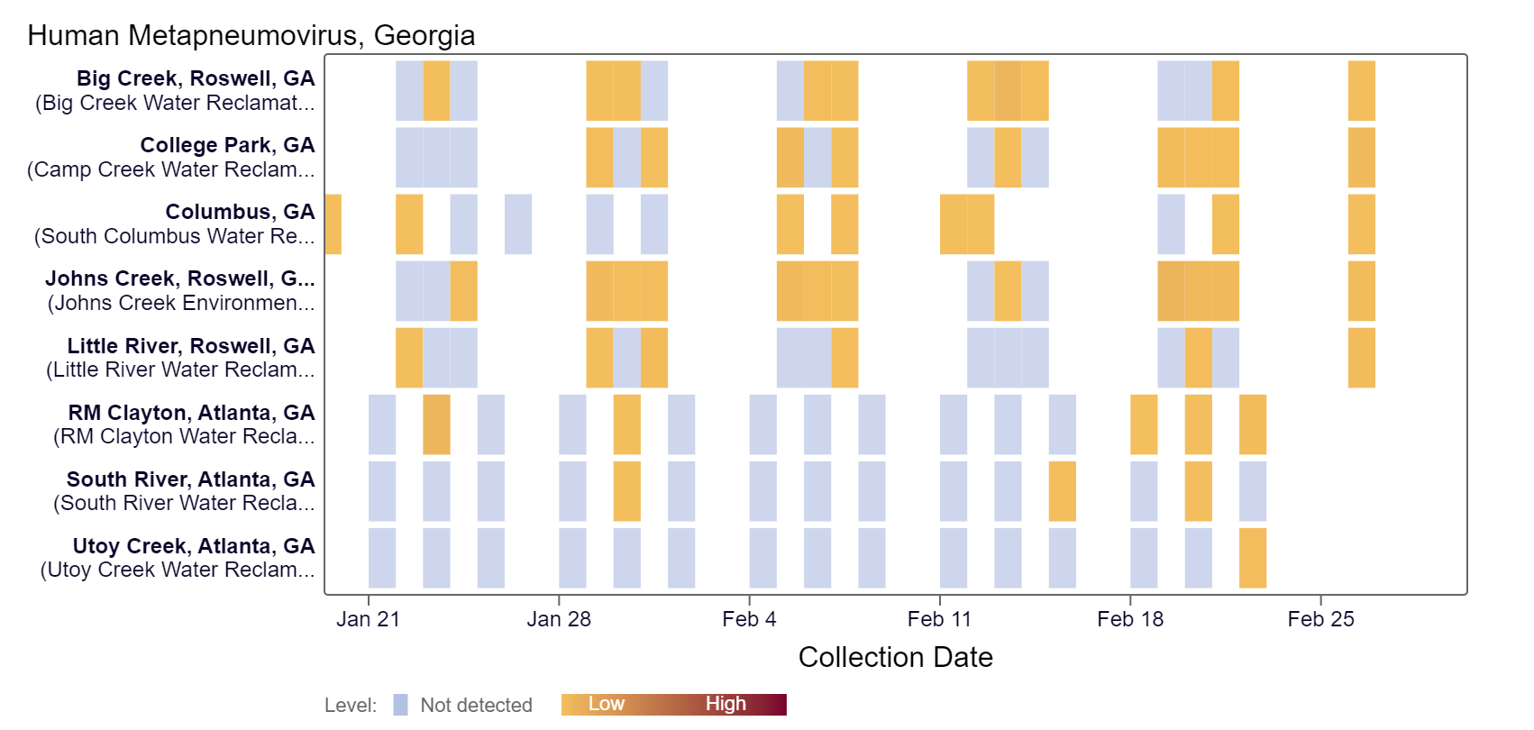 HMPV (human metapneumovirus) RNA concentrations in wastewater are below 42,000 copies/g. Based on the heat map below, HMPV has been detected at all Georgia locations within the last two weeks. HMPV RNA concentrations in Georgia are within the upper third level of all concentrations measured in the last year. Columbus and Johns Creek are in the HIGH (2 sites) Wastewater Category, as of 3/1/24. College Park, Big Creek, and Little River are in the LOW (3 sites) category. There was not enough data to calculate a category for RM Clayton, Utoy Creek, and South River (3 sites).