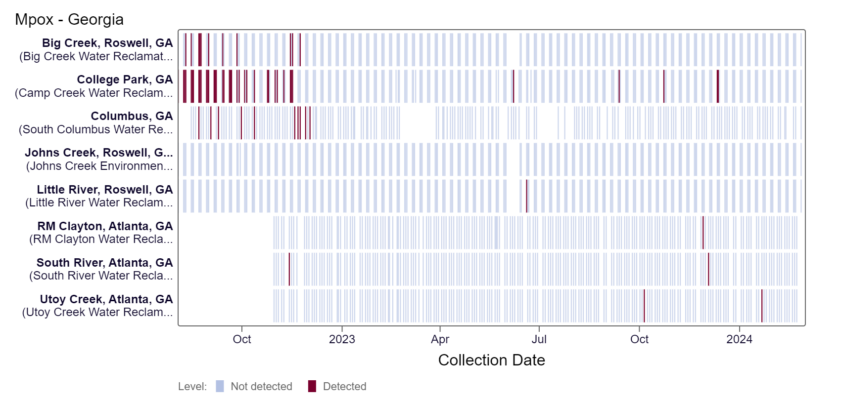 Mpox DNA results have been non-detect at all Georgia sites in the last 21 days. This heat map shows data since July 2022. Sites are labeled in the rows and each date a sample was collected as a column. The color blue means the sample was non-detect for mpox DNA and the color maroon means Mpox DNA was detected. White indicates no sample was collected. Most Georgia sites are in the LOW (5 sites) Wastewater Category as of 3/1/24.