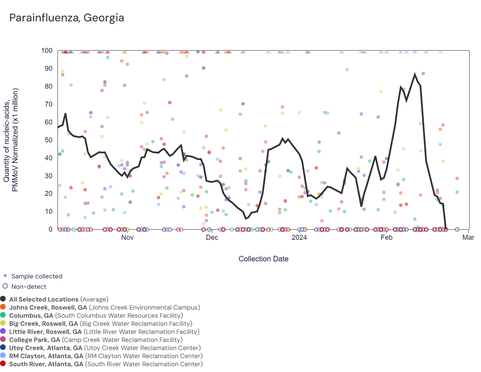Parainfluenza RNA has been more frequently detected at lower concentrations in samples collected from some Georgia sites (Columbus, Johns Creek, & RM Clayton) but sporadically at other sites. Parainfluenza concentrations have been less than 34,000 copies/g. The chart below shows the raw data and the population-weighted aggregated trend line for all 8 Georgia sites when the data is normalized by PMMoV. Concentrations have decreased in Georgia over the last two weeks.