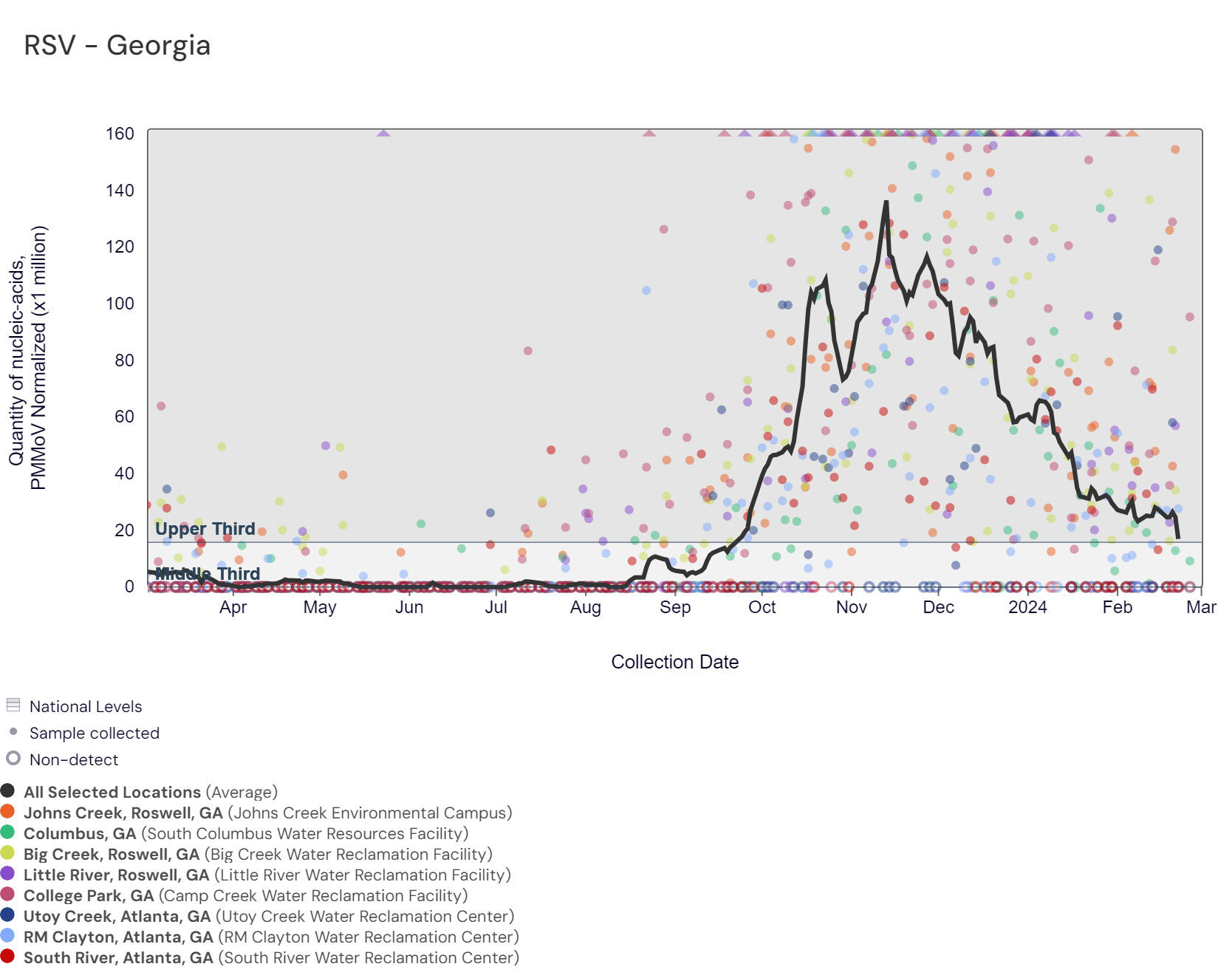 Respiratory syncytial virus (RSV) RNA concentrations were below 34,000 copies/gram over the last two weeks. The chart below includes the raw data for each site since 2023. The aggregated line below is within the dark shaded area, showing that RSV RNA concentrations among Georgia sites are within the upper third level of all concentrations measured in the last year. Levels continue to approach the middle range.