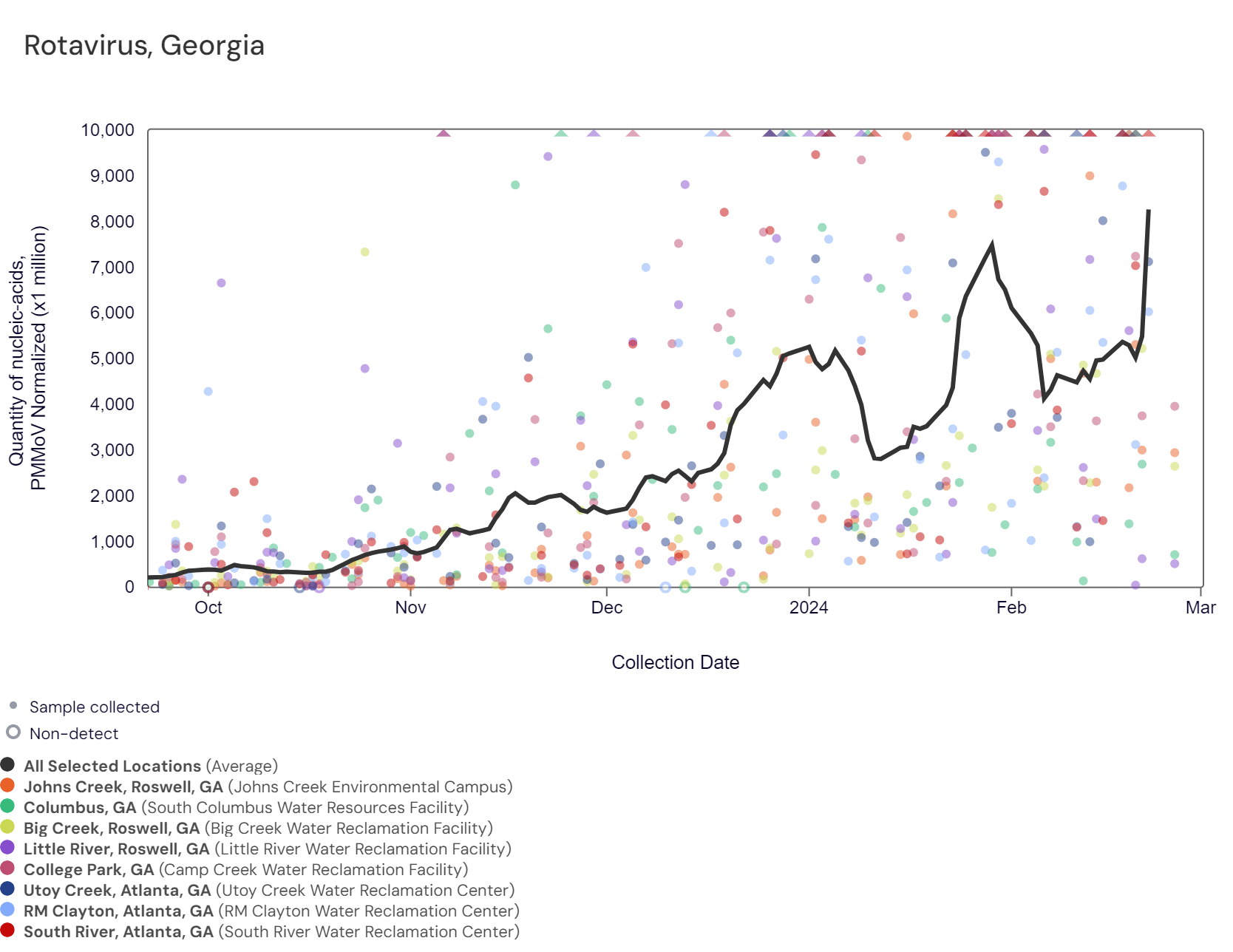 Rotavirus RNA concentrations have been between 200,000 - 2,700,000 copies/g over the last two weeks. The chart below shows the population-weighted average line is shown in black plus the raw data for each site. As of 3/1/24, College Park, Columbus, Little River, Big Creek, and Johns Creek are in the HIGH (5 sites) Wastewater category. There was not enough data to calculate a category for RM Clayton, Utoy Creek, and South River (3 sites).