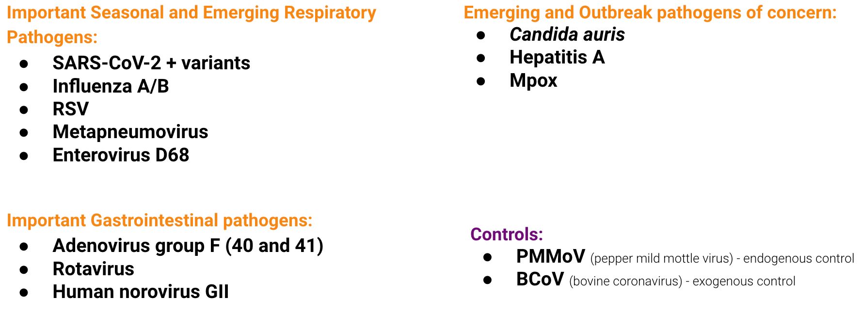 Currently monitoring a suite of Respiratory, Gastrointestinal and Outbreak Pathogens of Concern